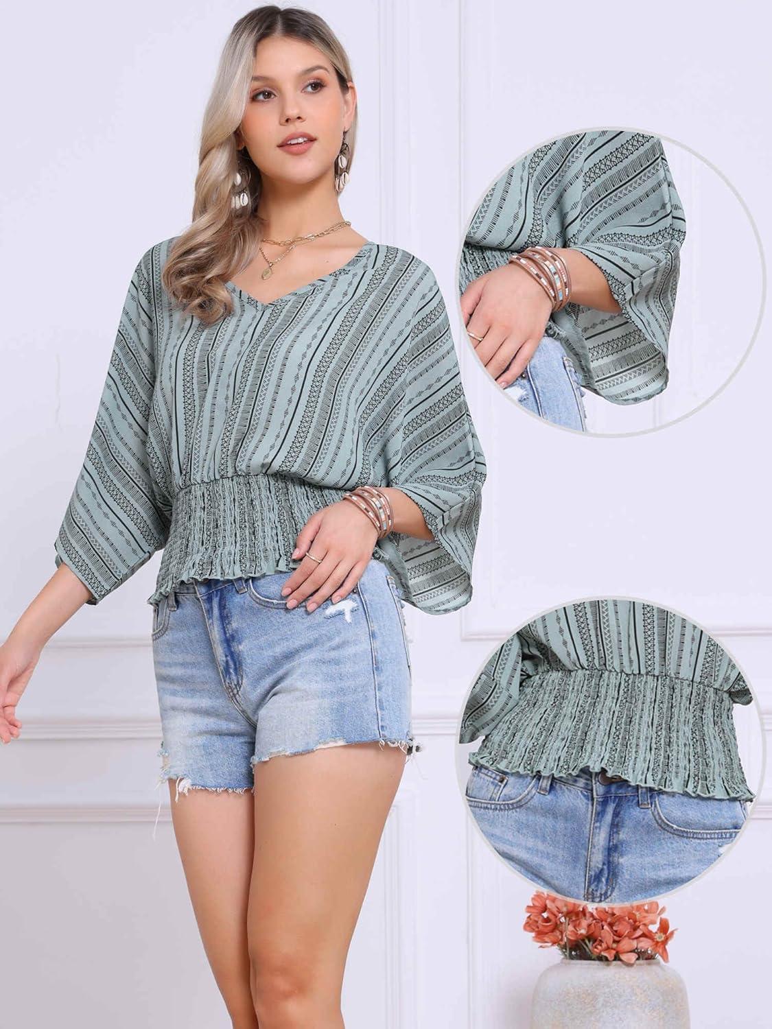 Allegra K Tops for Women's Summer Boho V Neck Print Chiffon Top Smocked Batwing Dolman Sleeve Blouses(Light Gray Green)