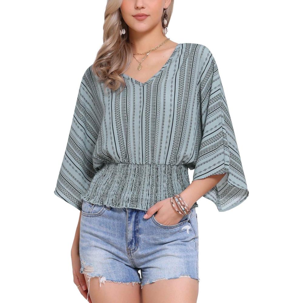 imageAllegra K Tops for Womens Summer Boho V Neck Print Chiffon Top Smocked Batwing Dolman Sleeve BlousesLight Gray Green