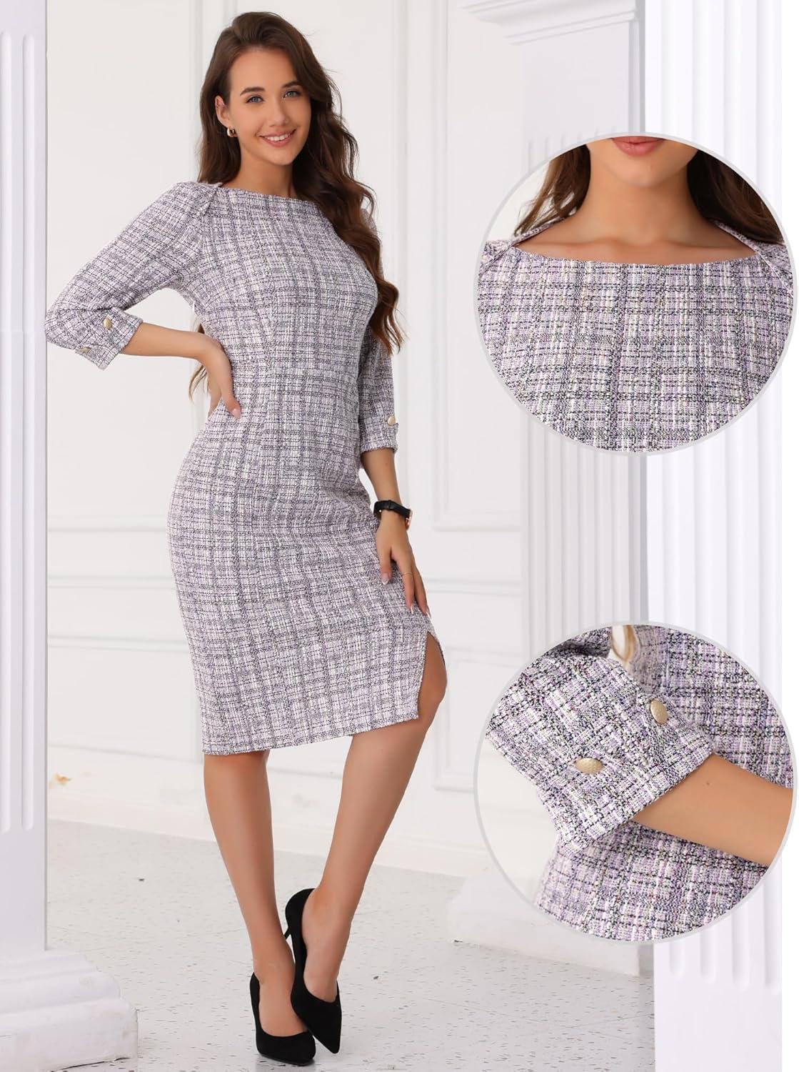 Allegra K Tweed Dress for Women's Fall Elegant Boat Neck 3/4 Sleeve 2025 Work Dress(White Purple)