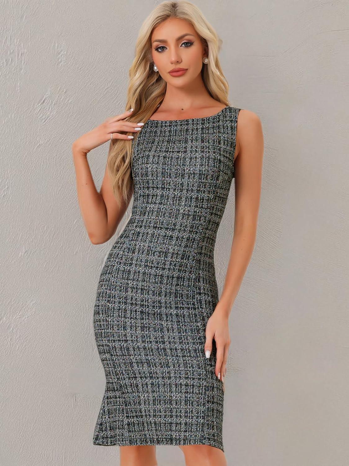 Allegra K Tweed Dress for Women’s Summer Sleeveless Elegant Plaid Bodycon Dresses(Green)