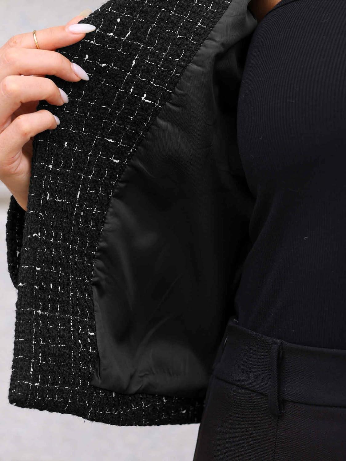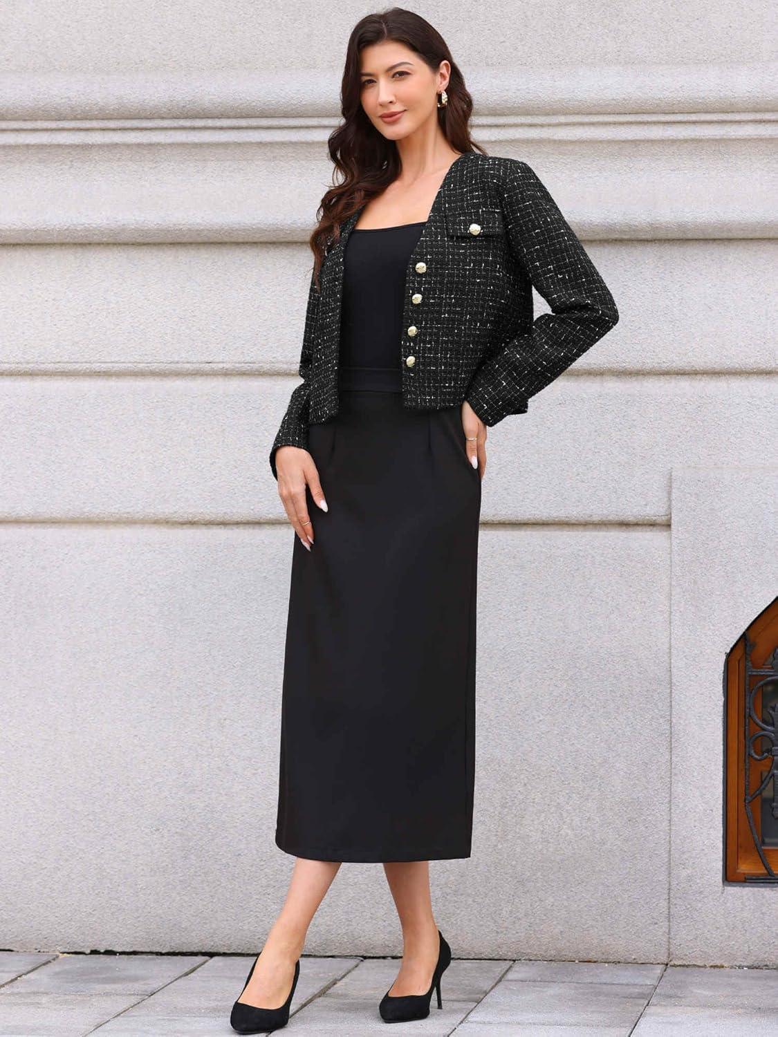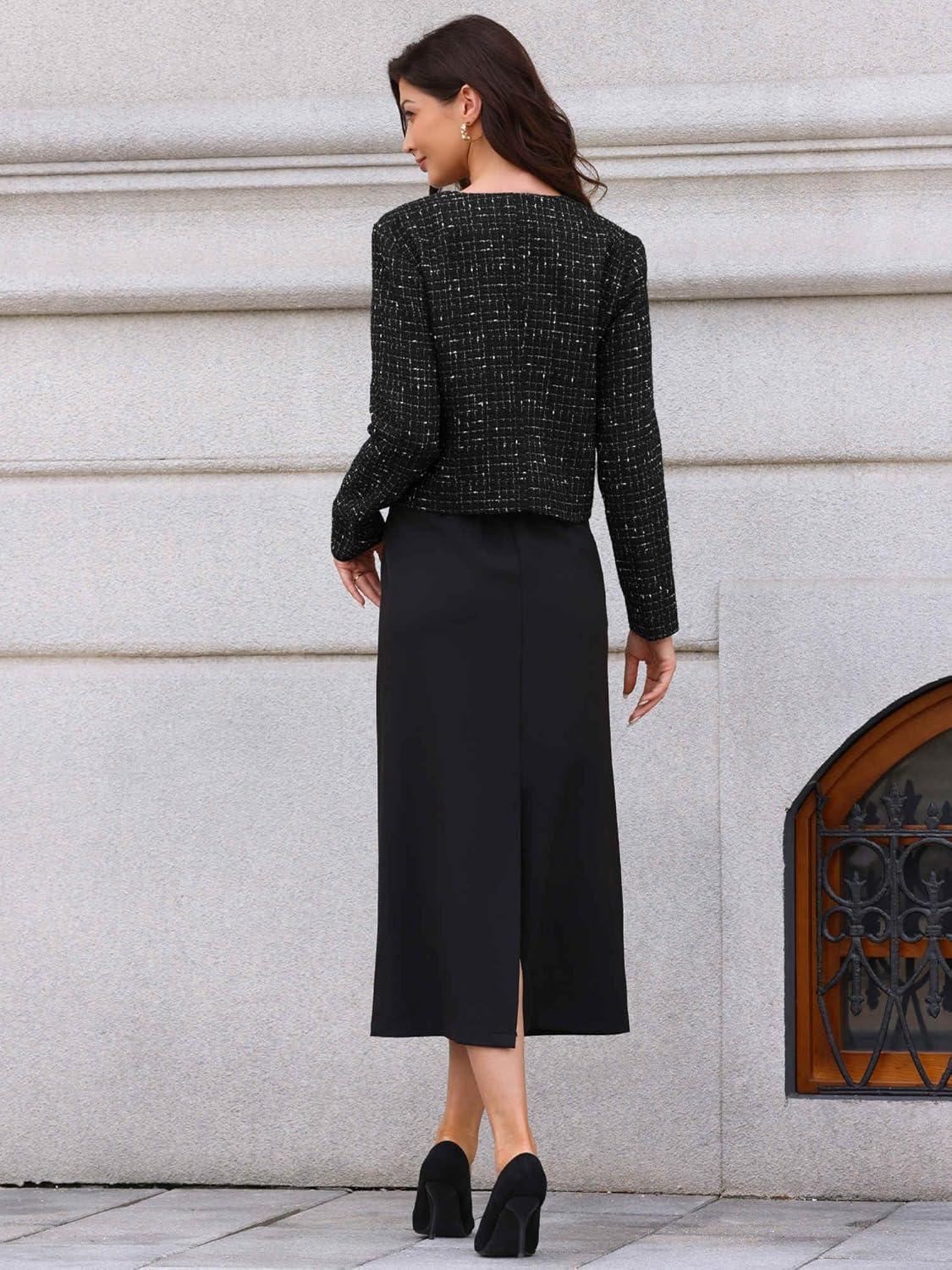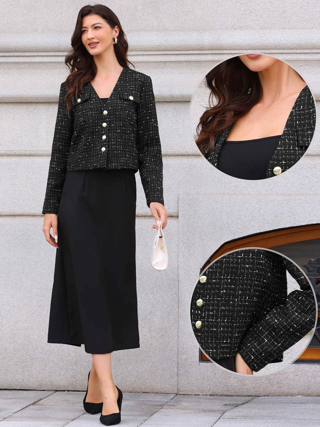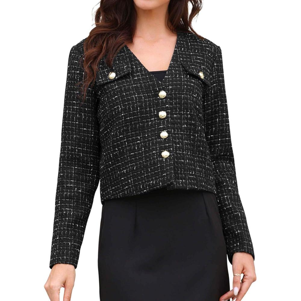 Allegra K Tweed Jacket Women Long Sleeve Button Down Collarless Business Casual Blazer Fall Trendy Cropped Jackets(Black)