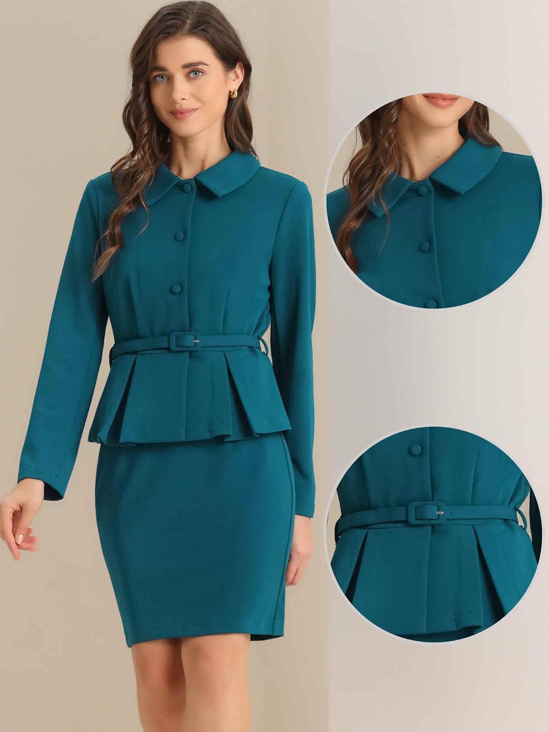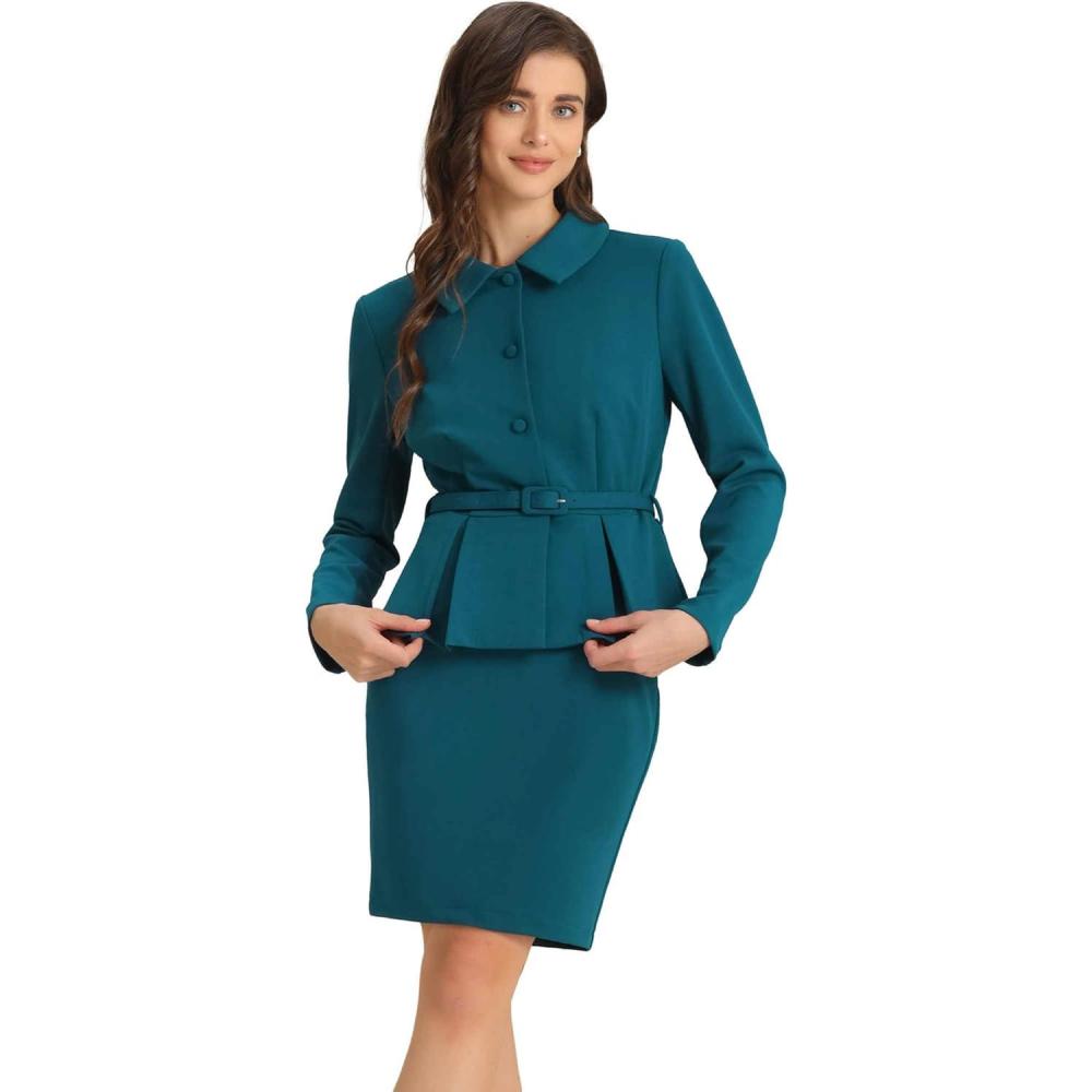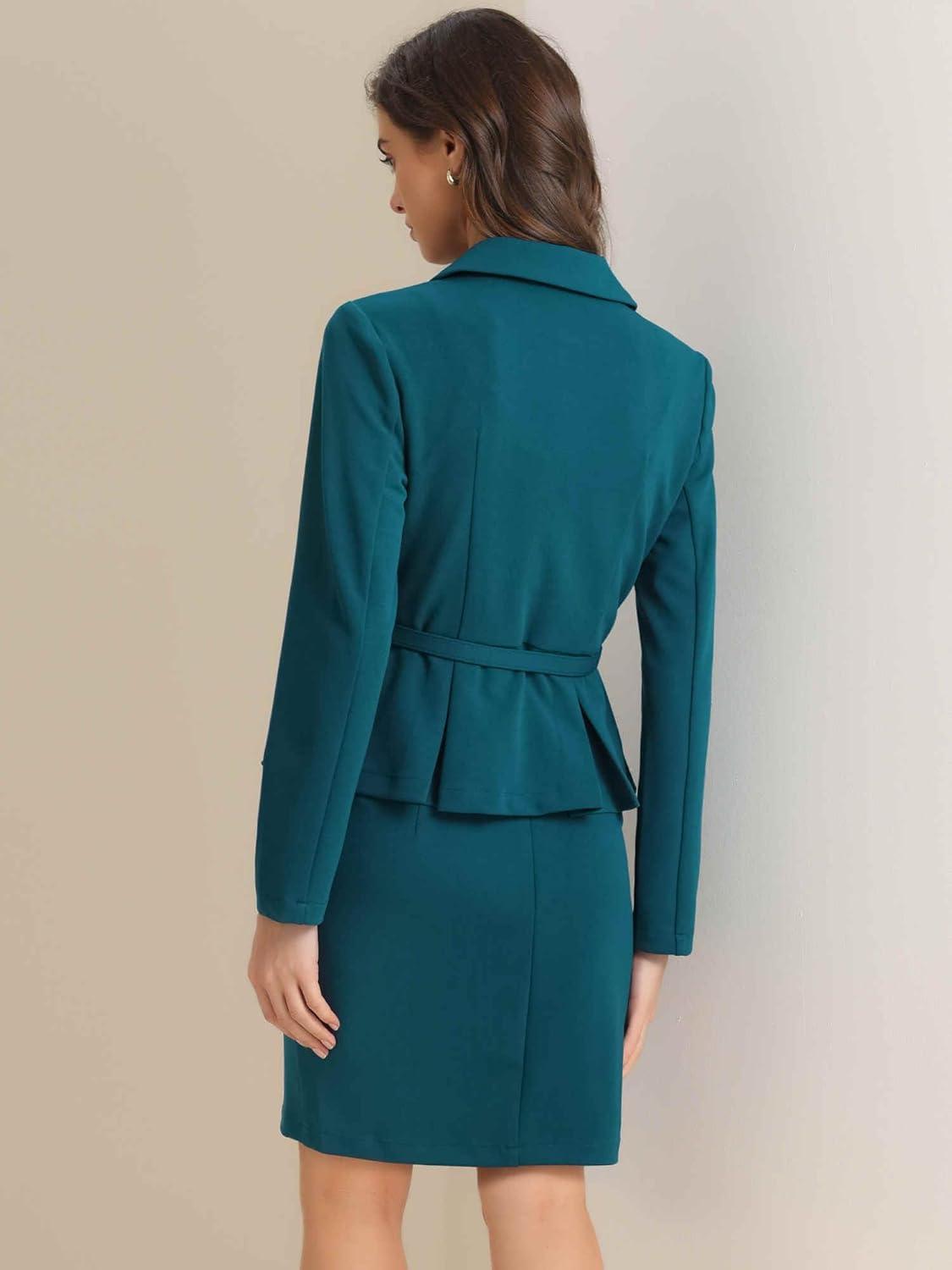 Allegra K Two Pieces Suits for Women’s Business Peplum Blazer Jacket Mini Pencil Skirt Sets(Blue Green)