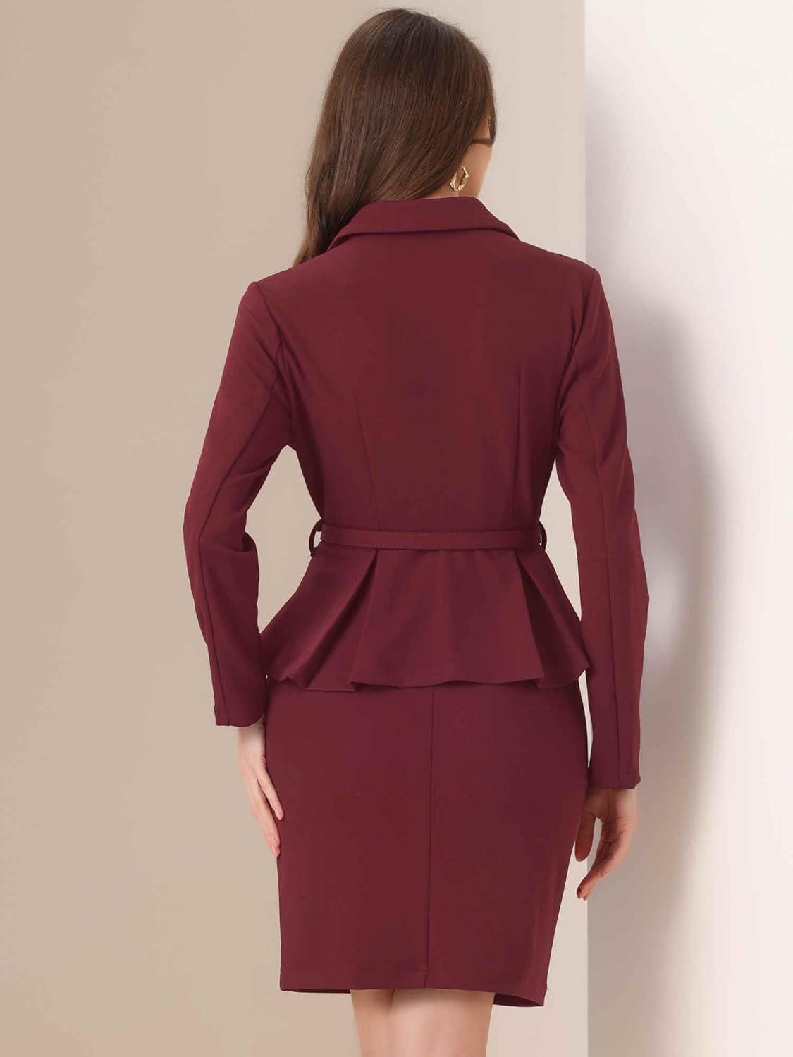 Allegra K Two Pieces Suits for Women’s Business Peplum Blazer Jacket Mini Pencil Skirt Sets(Burgundy)