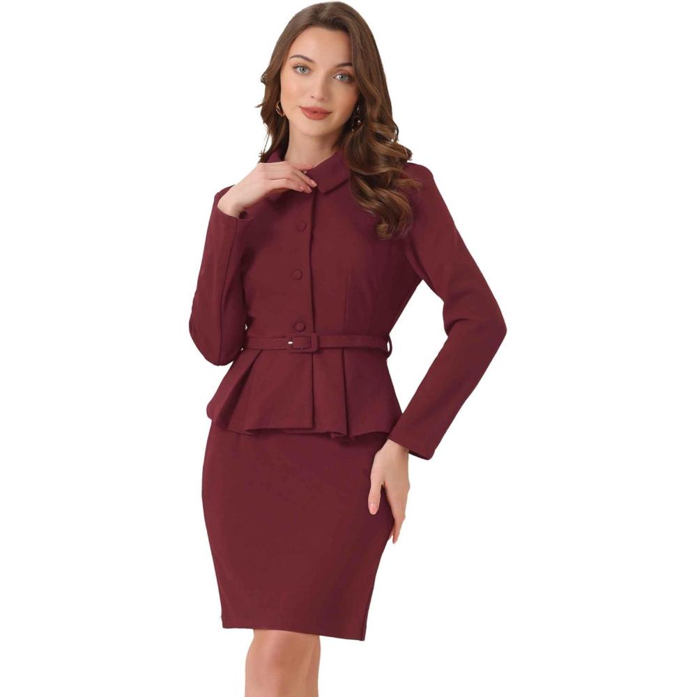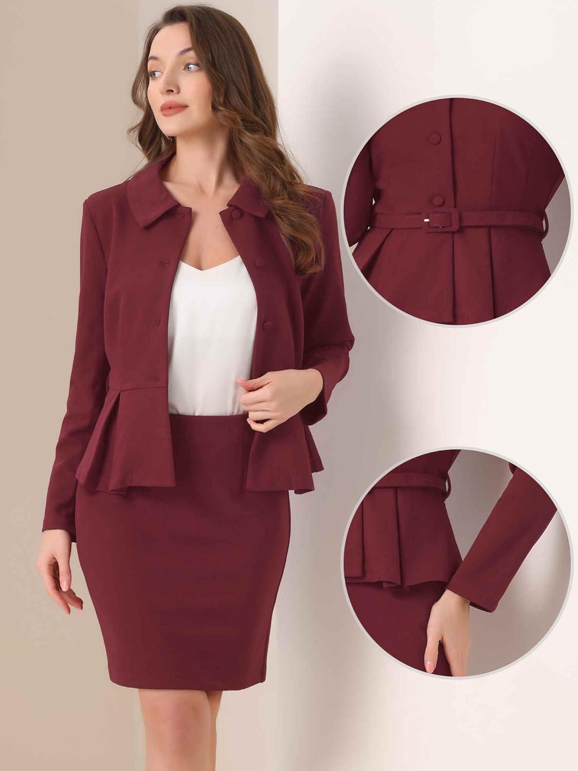 imageAllegra K Two Pieces Suits for Womens Business Peplum Blazer Jacket Mini Pencil Skirt SetsBurgundy