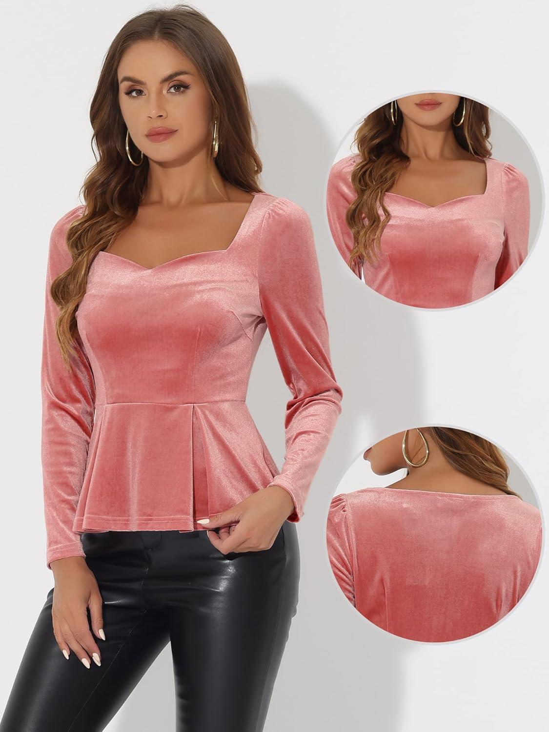 Allegra K Velvet Blouse for Women’s Elegant Sweetheart Neck Long Sleeve Peplum Top(Pink)