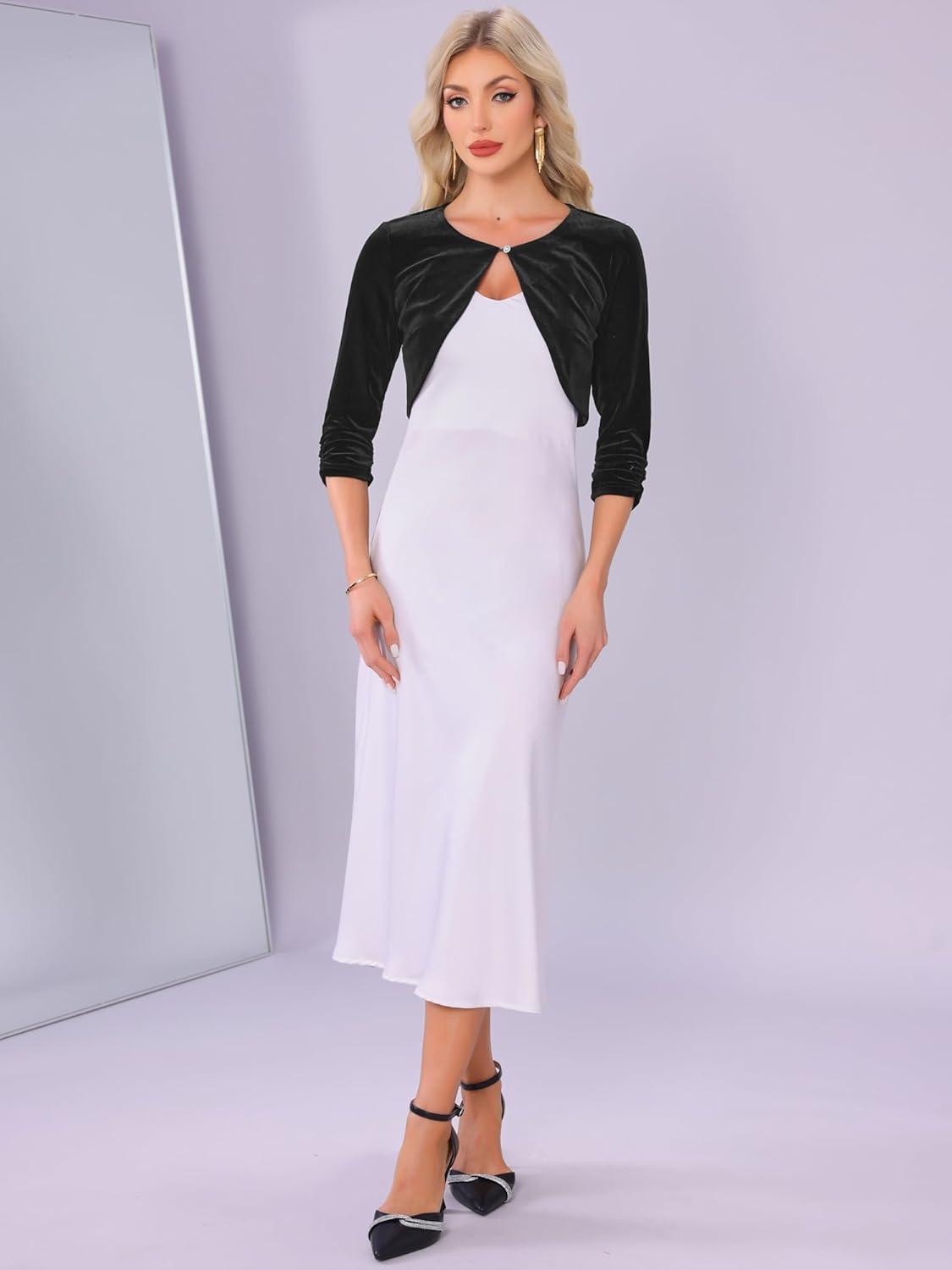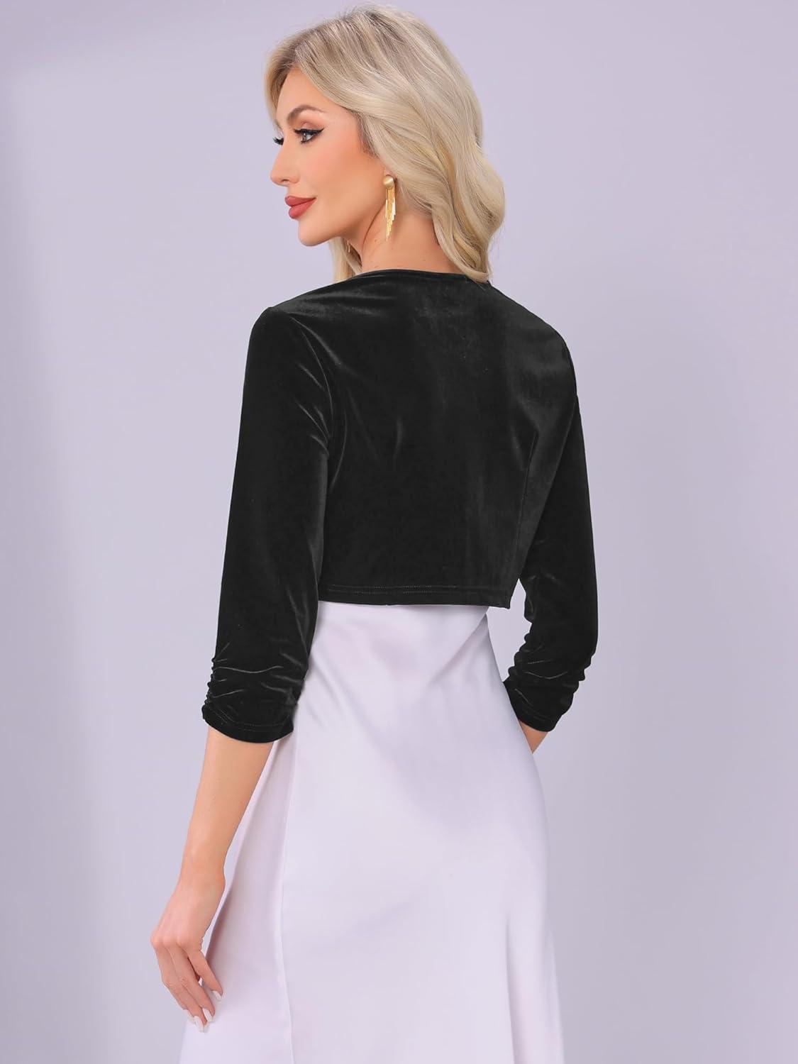 Allegra K Velvet Shrug for Women Crew Neck Ruched 3/4 Sleeves Cocktail Party Cropped Cardigan(Black)