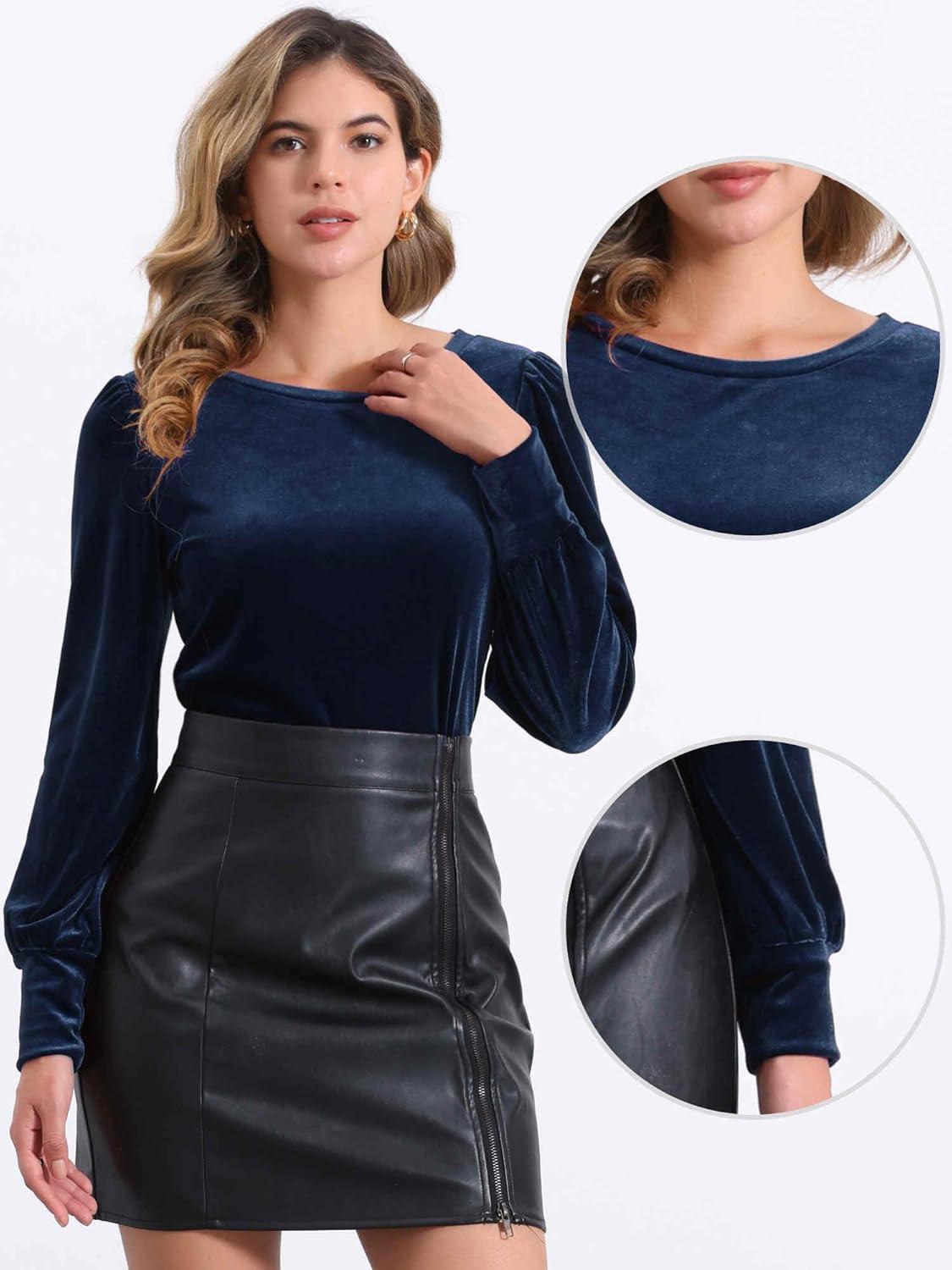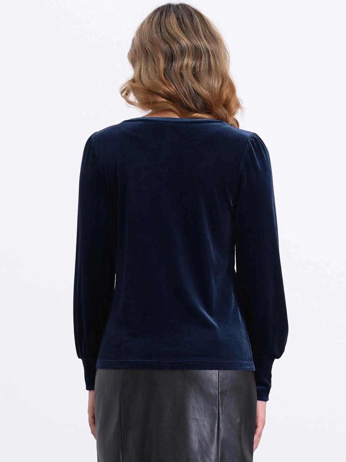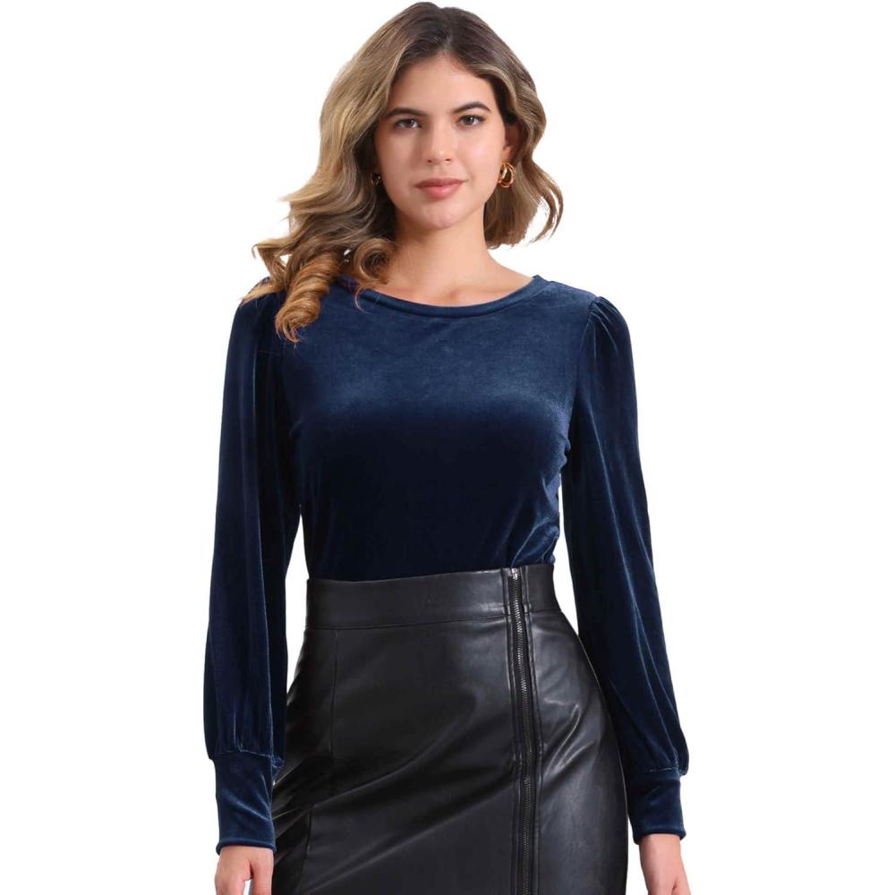 Allegra K Velvet Tops for Women Crew Neck Puff Long Sleeve Casual Pullover Fall Winter Blouses Top(Dark Blue)