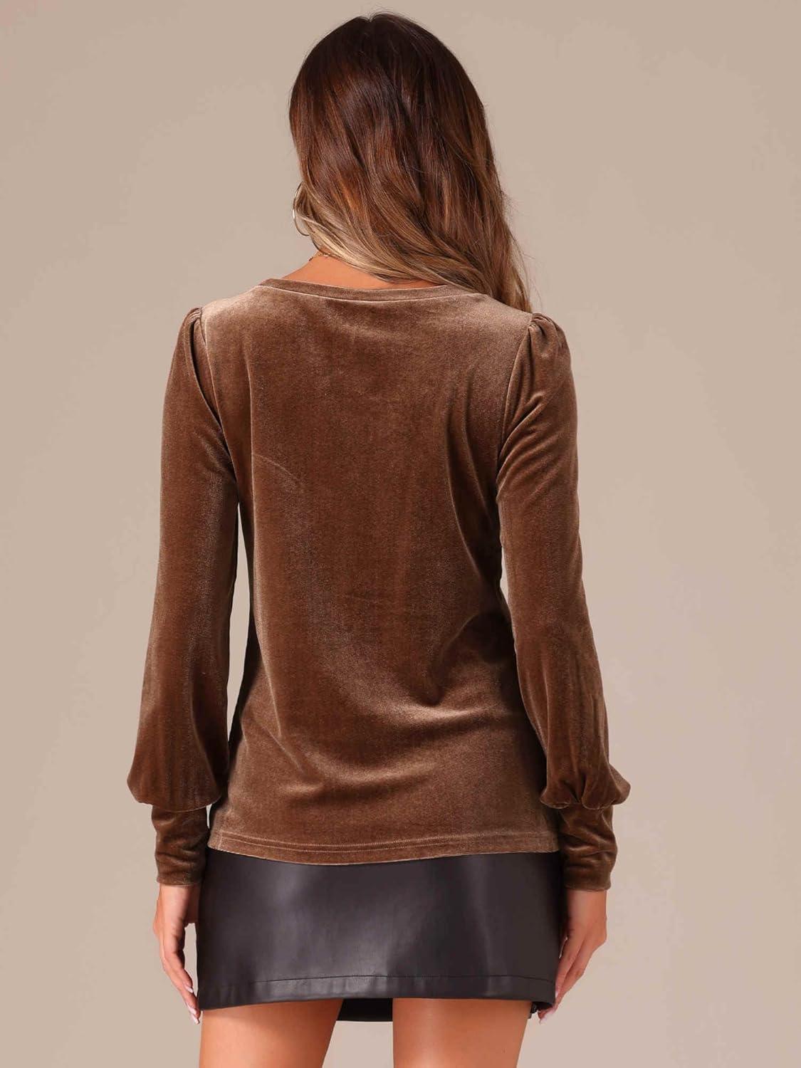 Allegra K Velvet Tops for Women Crew Neck Puff Long Sleeve Casual Pullover Fall Winter Blouses Top(Dark Khaki)
