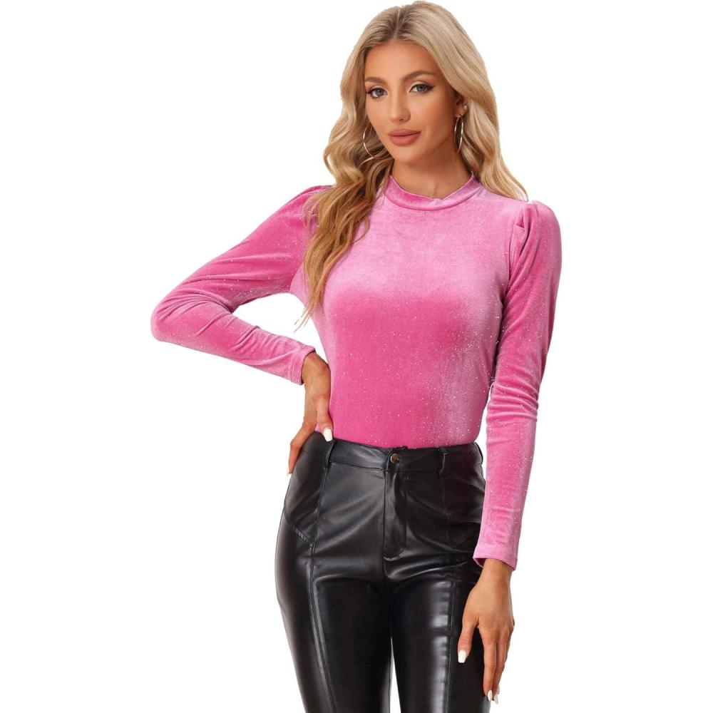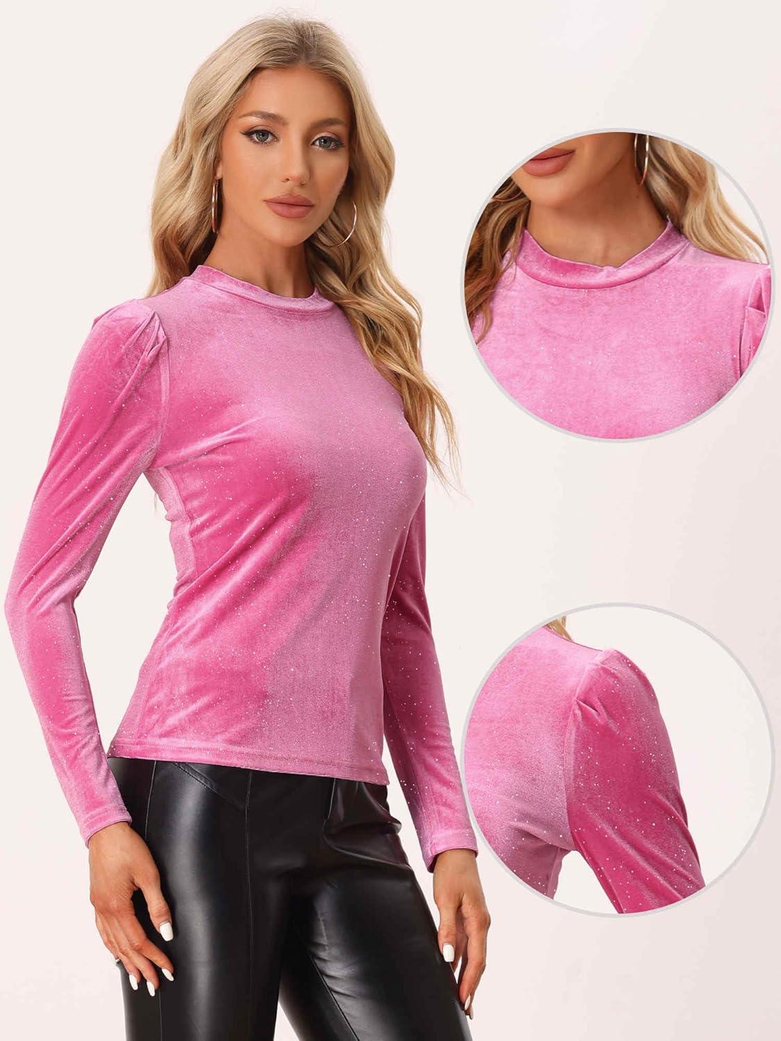 imageAllegra K Velvet Tops for Womens Puff Long Sleeve Mock Neck Vintage Christmas Shiny Metallic BlouseHot Pink