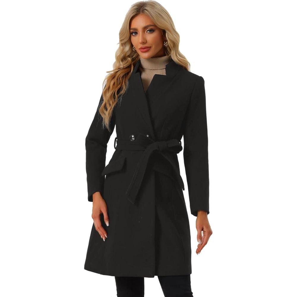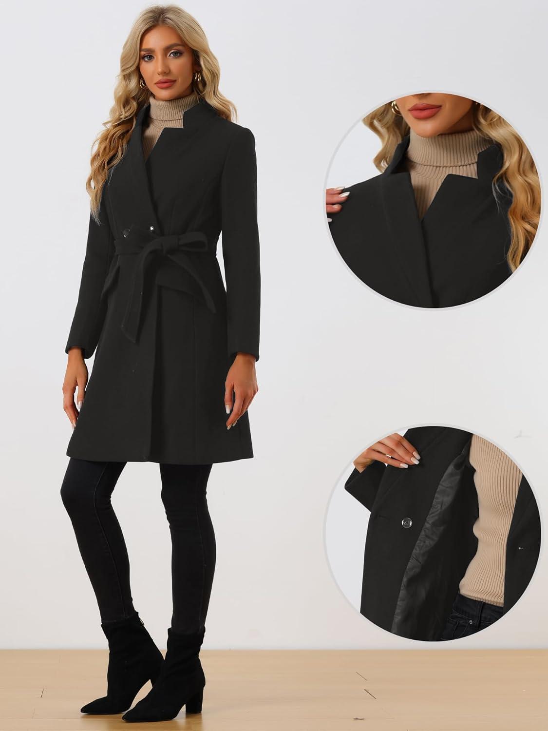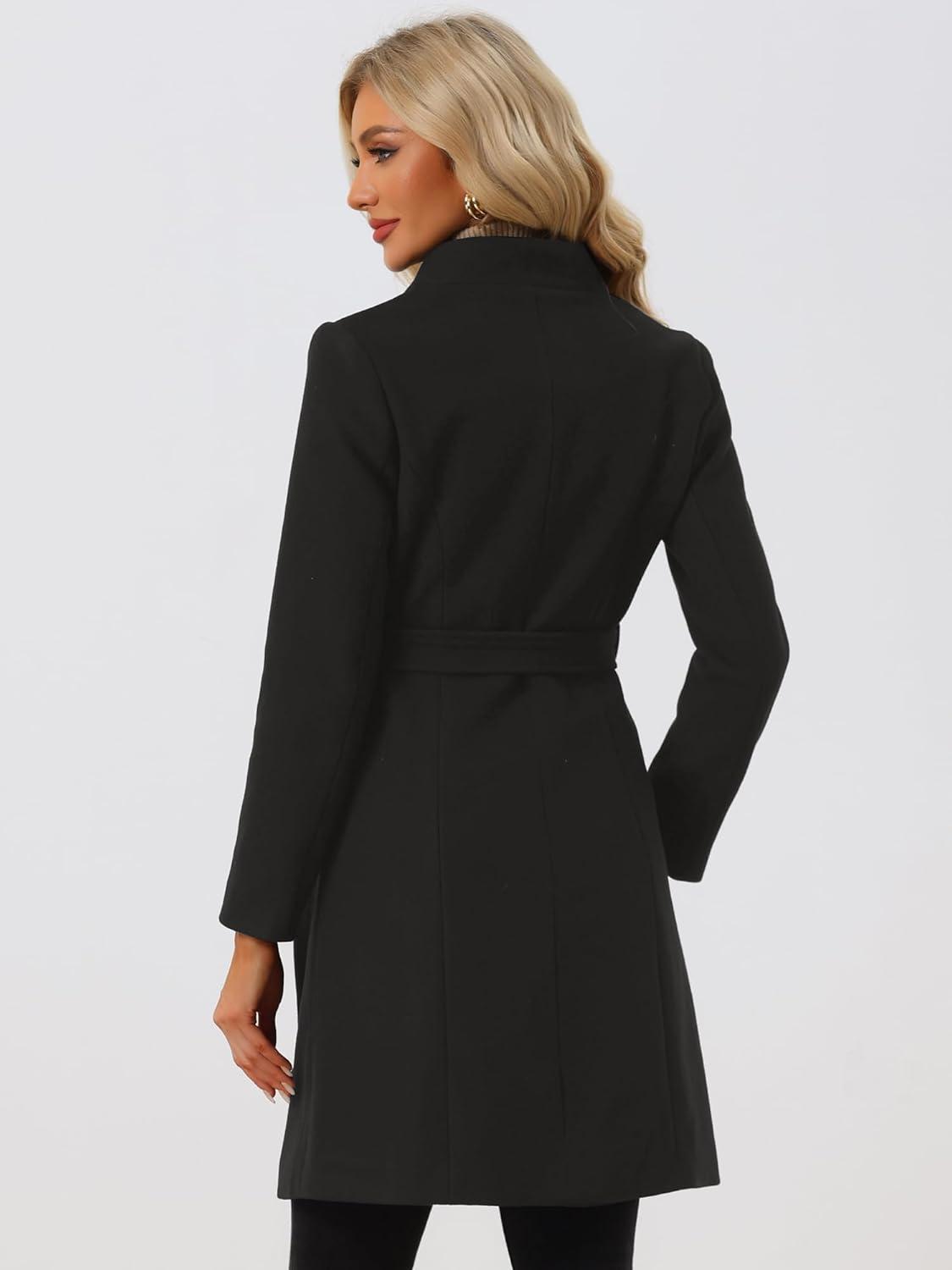 Allegra K Winter Pea Coat for Women’s Classic Outwear Stand Collar Wrap Belted Trench Coats(Black)