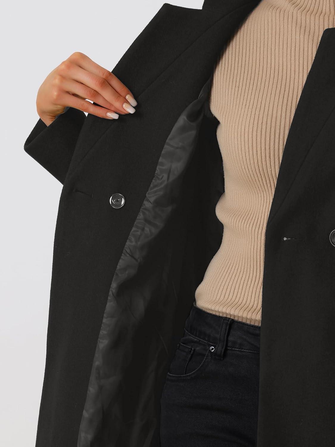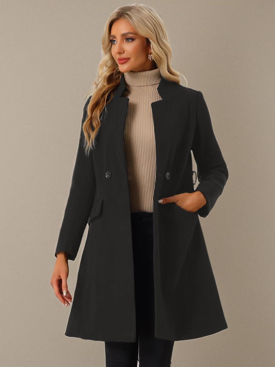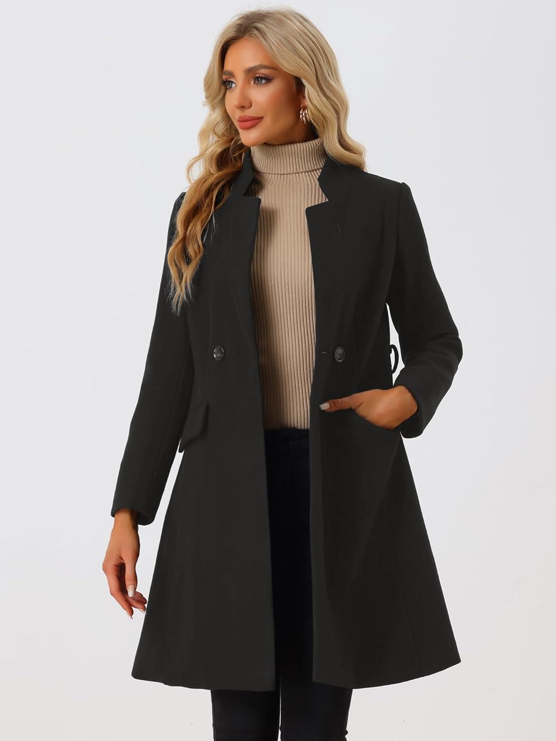 Allegra K Winter Pea Coat for Women’s Classic Outwear Stand Collar Wrap Belted Trench Coats(Black)