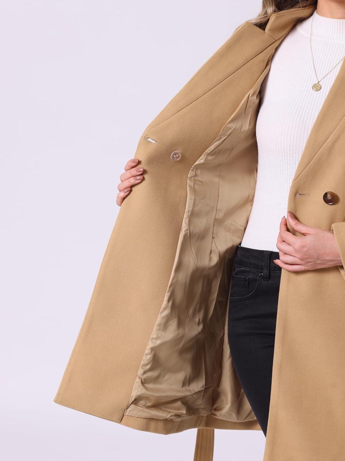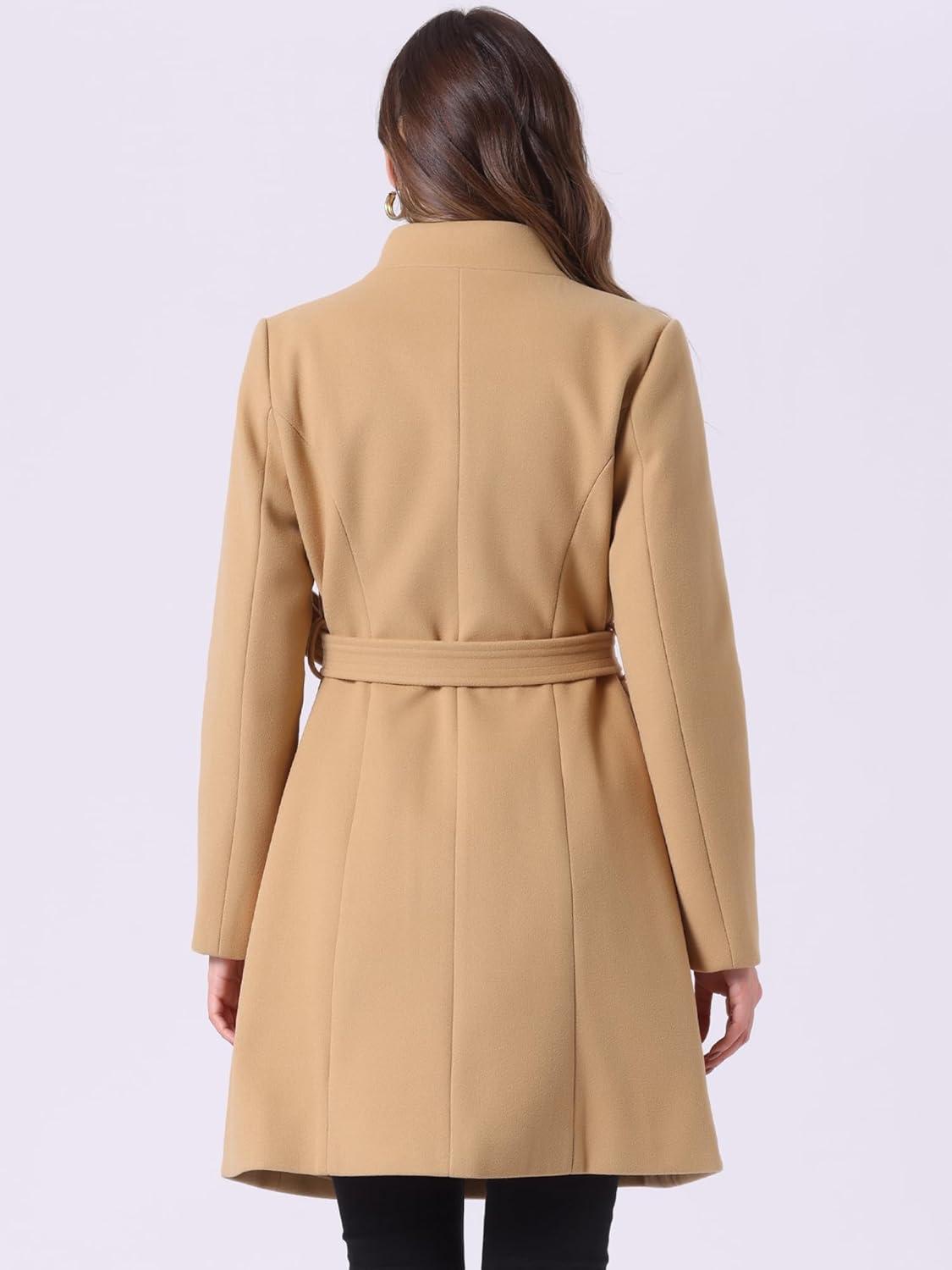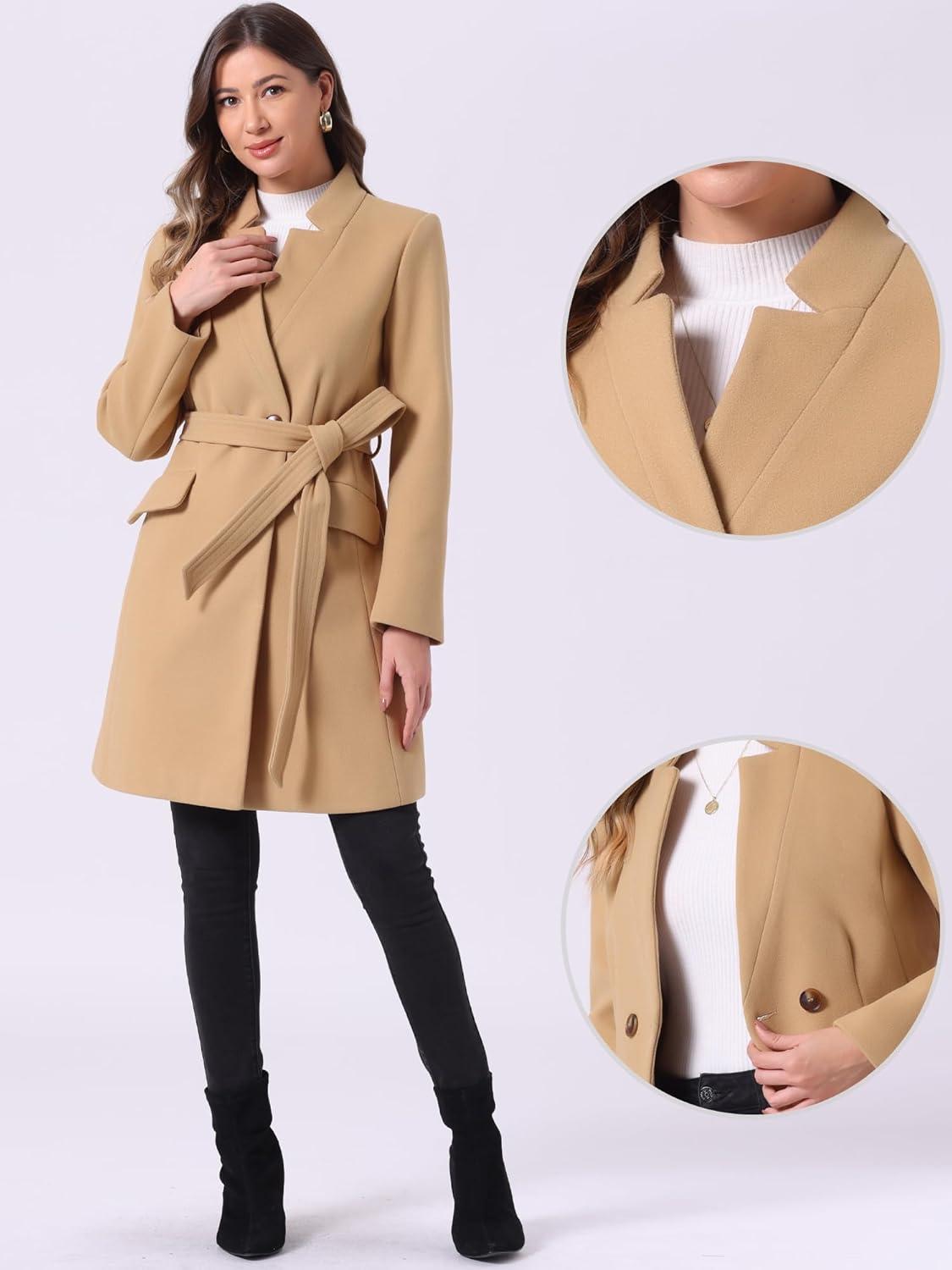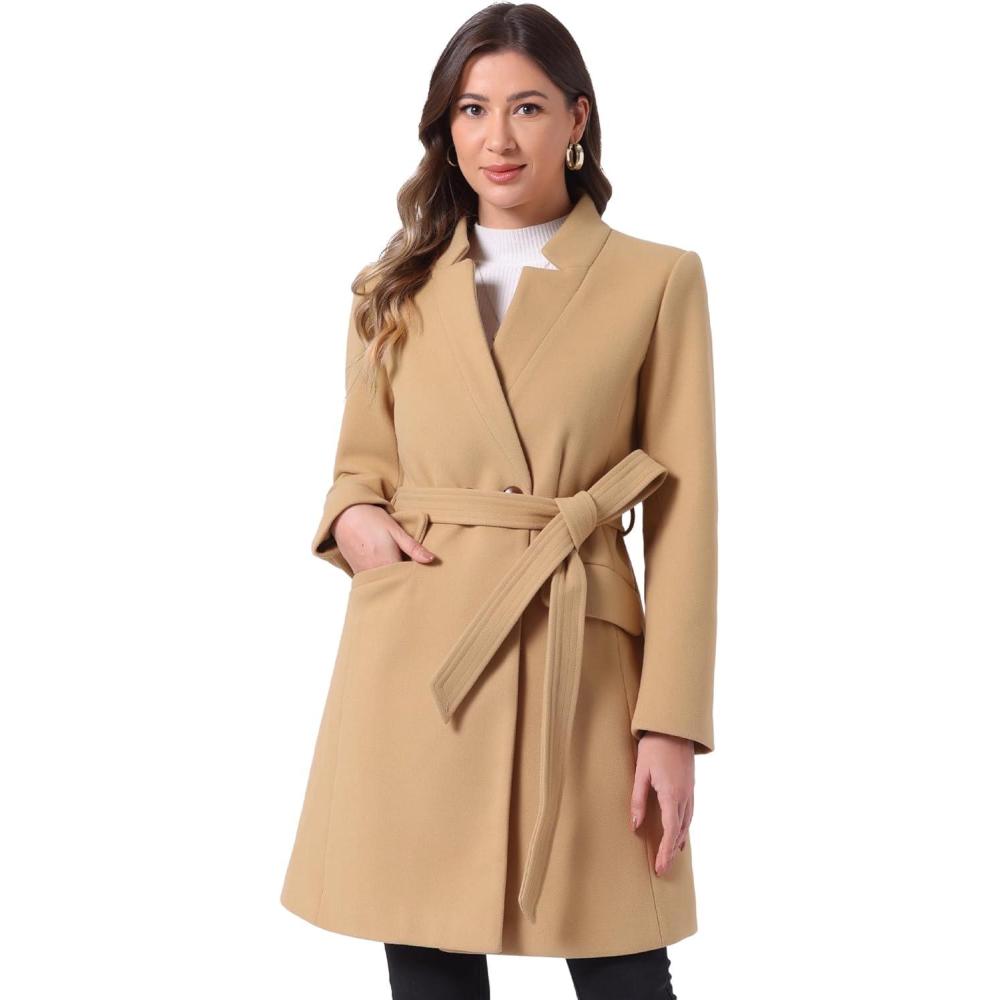 Allegra K Winter Pea Coat for Women’s Classic Outwear Stand Collar Wrap Belted Trench Coats(Khaki)
