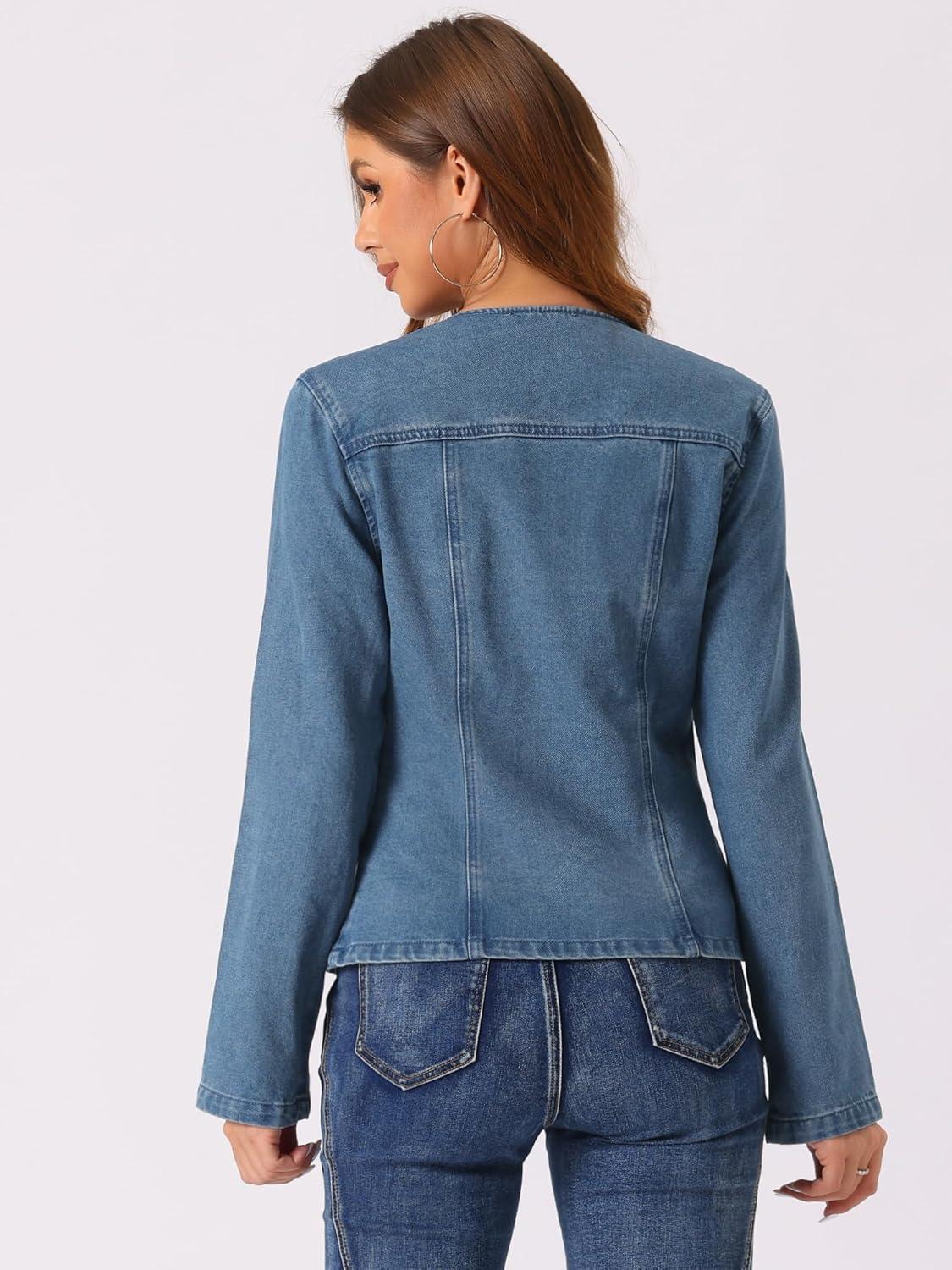 imageAllegra K Women Cropped Jean Jacket Long Sleeve Collarless One Button Lightweight Stretchy Fitted Denim Shacket JacketsLight Blue