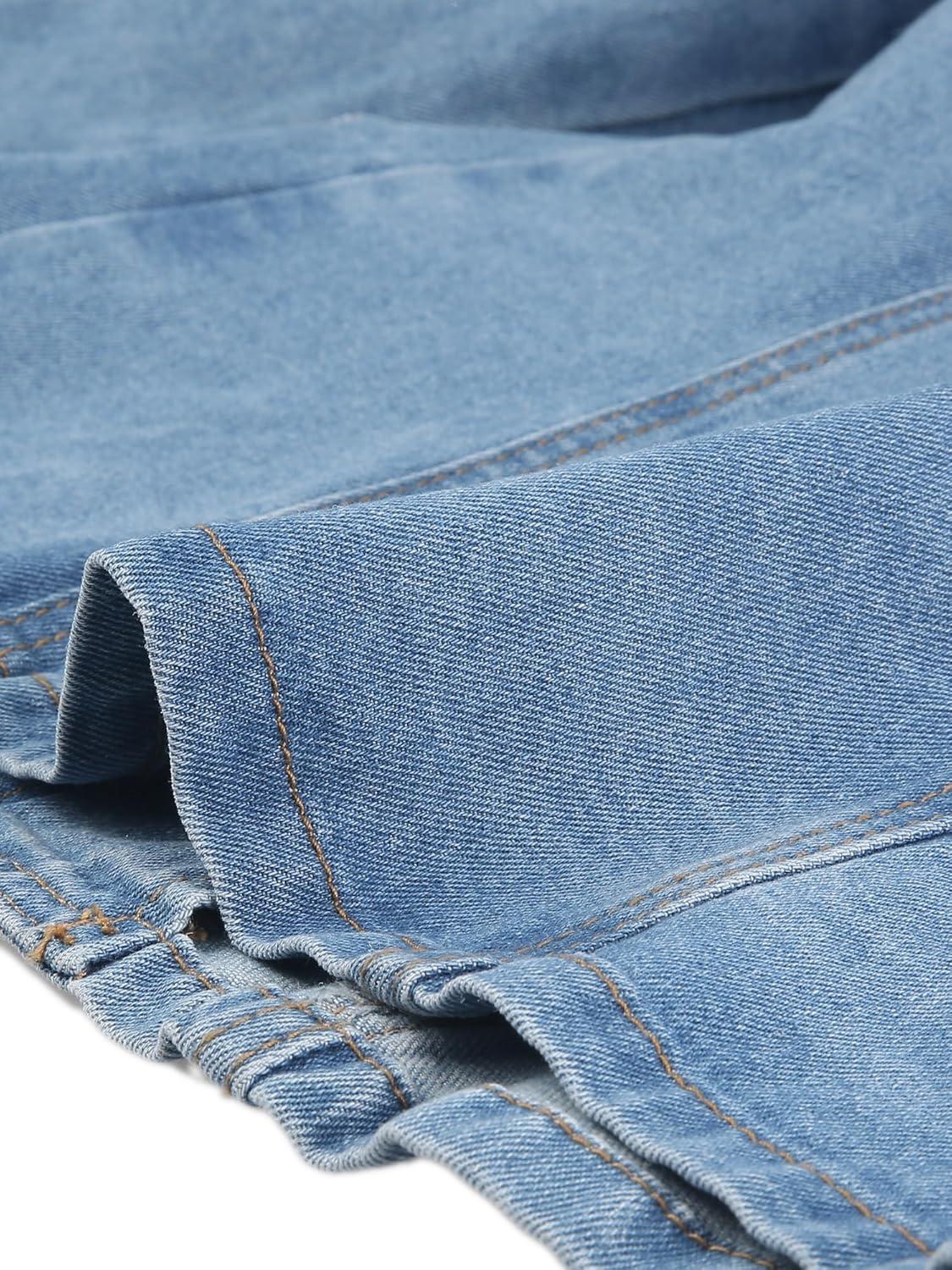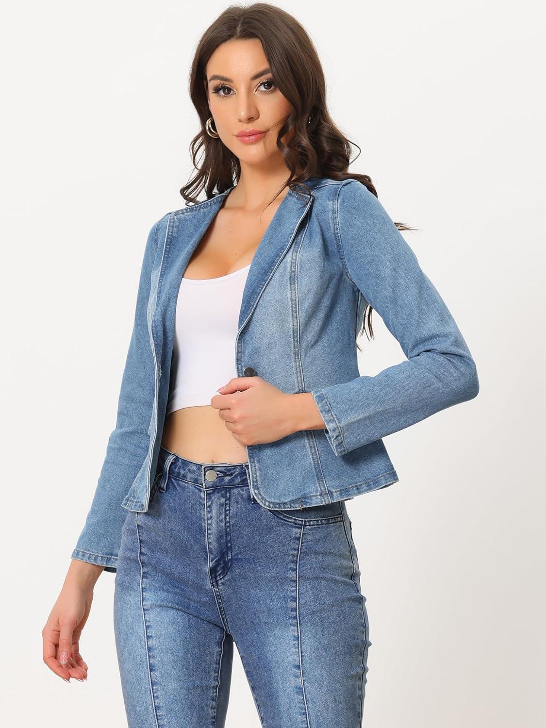 Allegra K Women Cropped Jean Jacket Long Sleeve Collarless One Button Lightweight Stretchy Fitted Denim Shacket Jackets(Ice Blue)