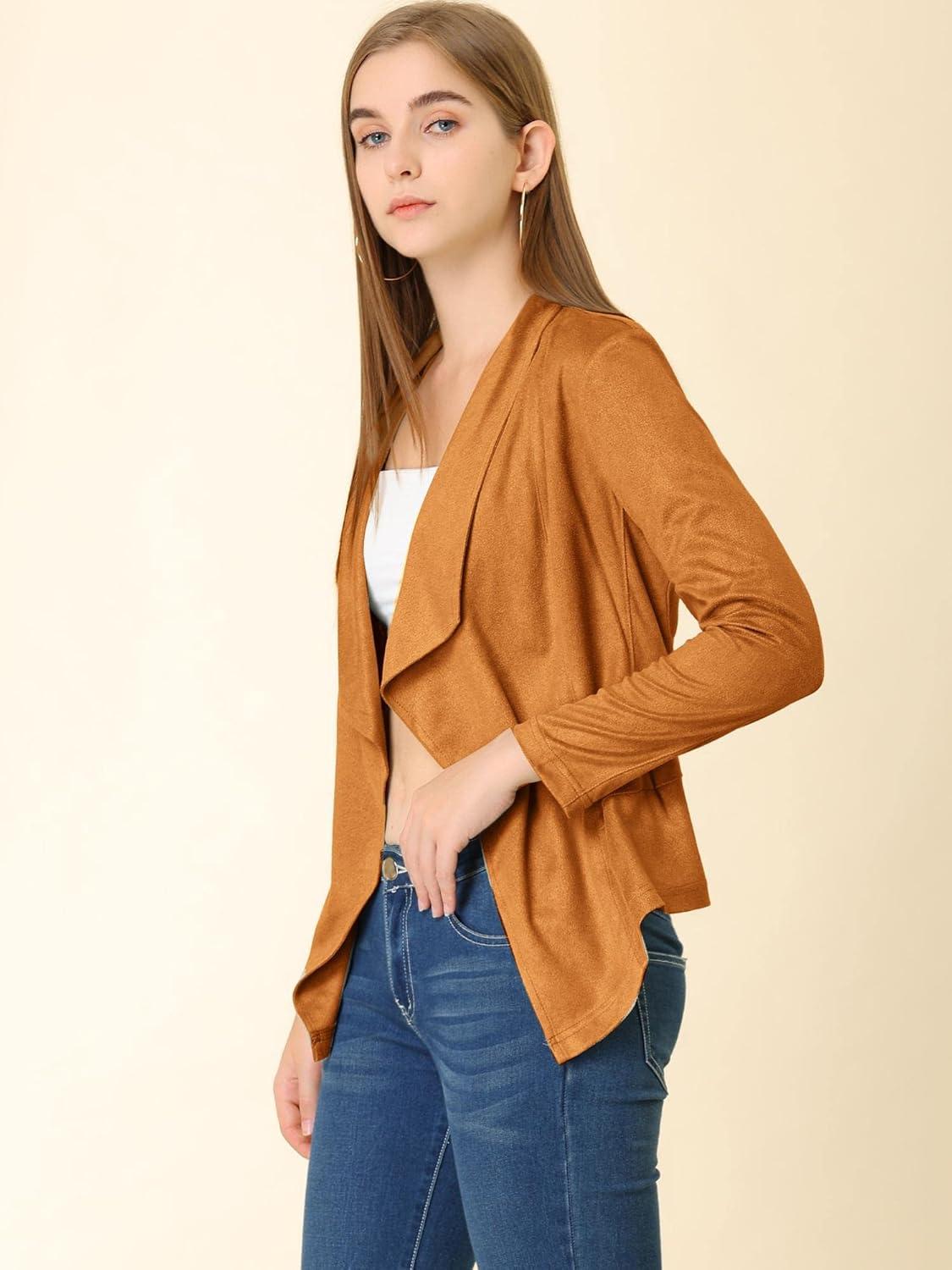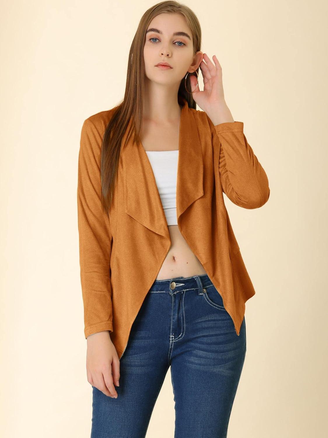 Allegra K Women Faux Suede Jacket Lapel Draped Open Front Cardigan Casual Trendy Suede Blazer(Caramel)