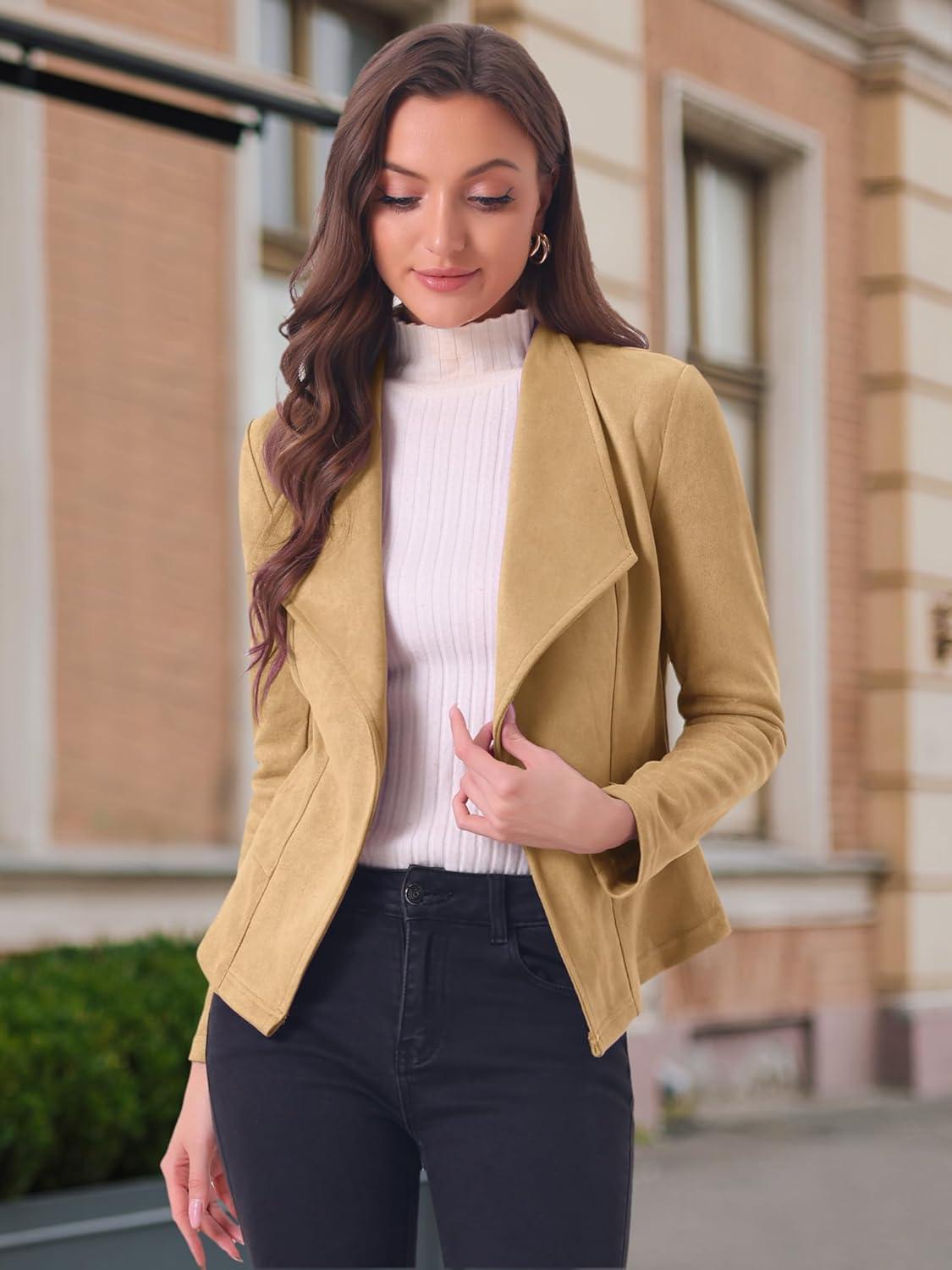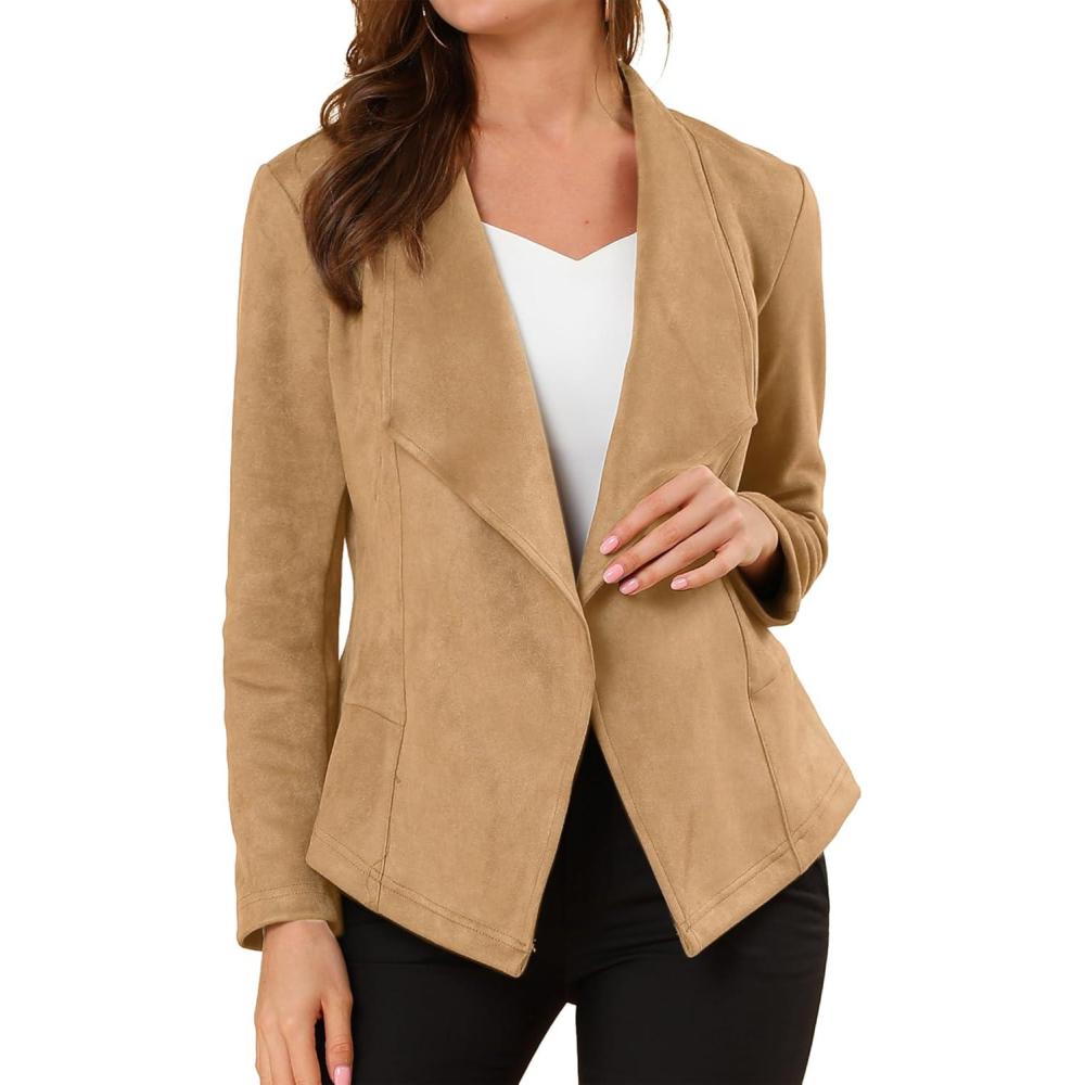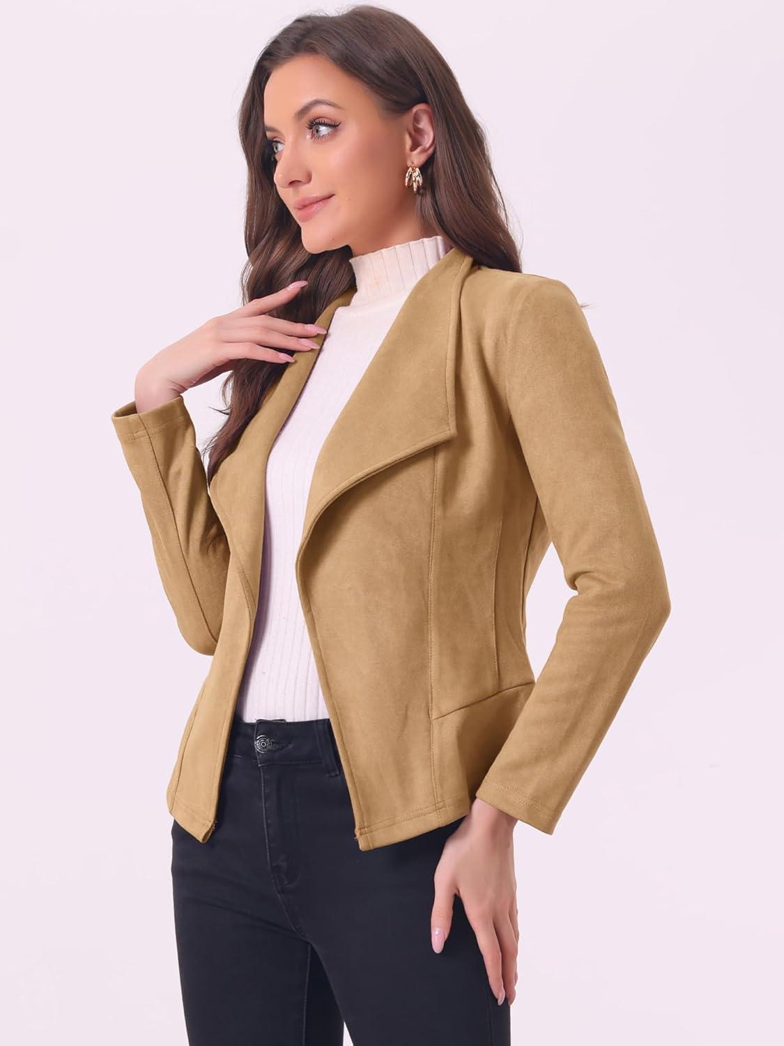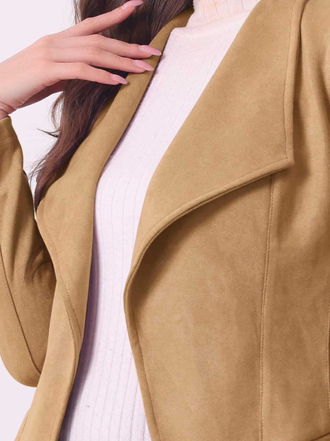 Allegra K Women Faux Suede Jacket Lapel Draped Open Front Cardigan Casual Trendy Suede Blazer(Khaki)