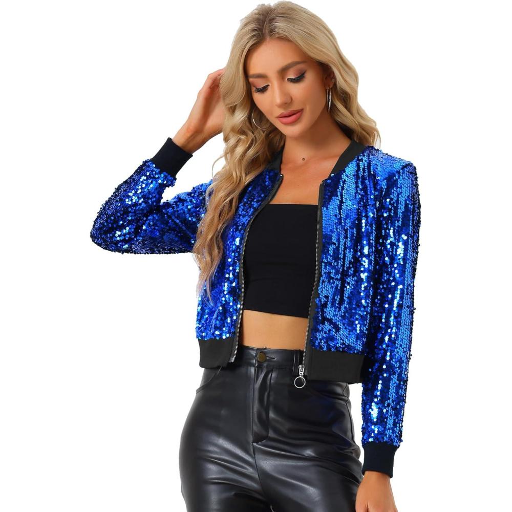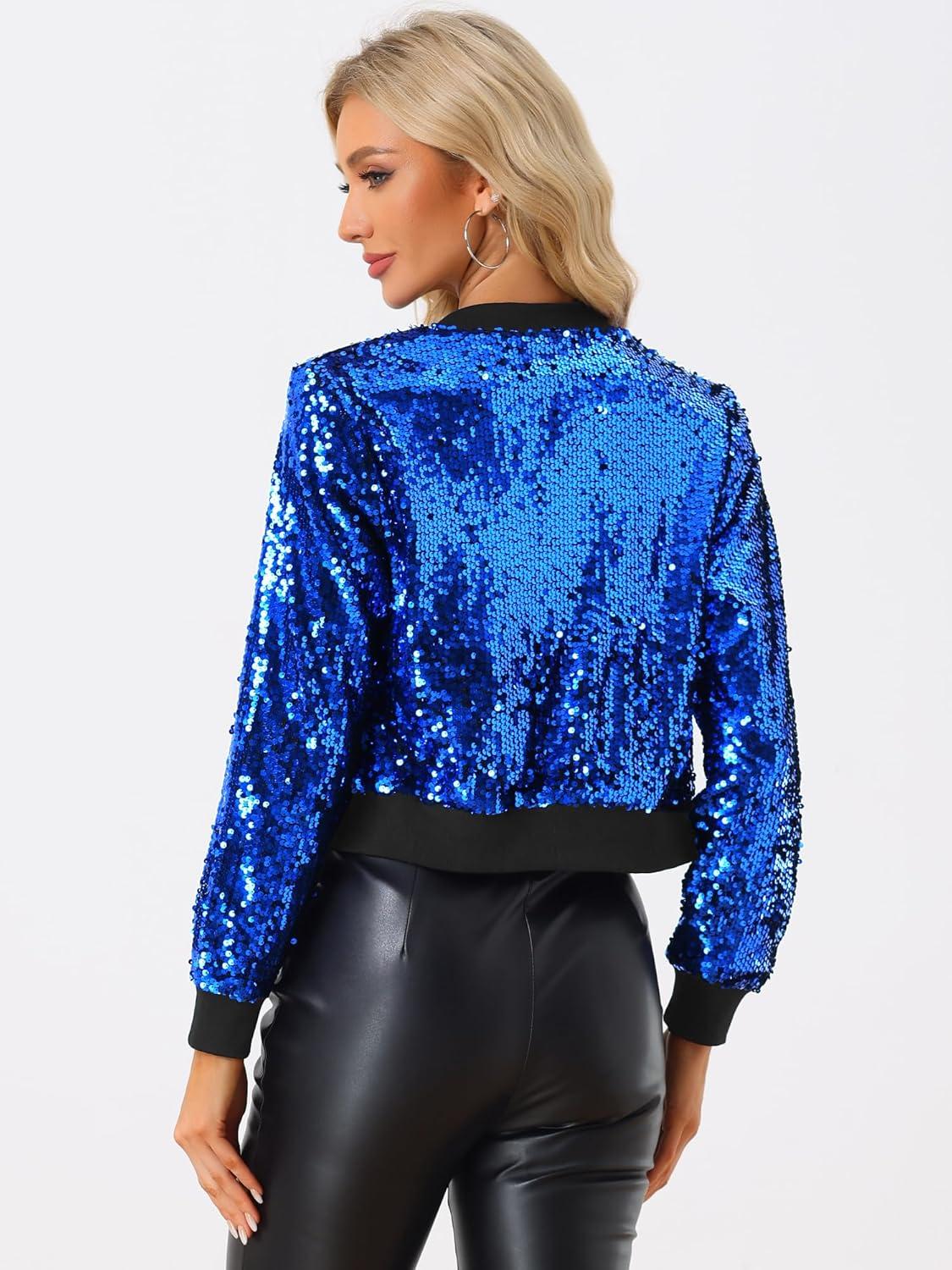 Allegra K Women Sequin Bomber Jackets Halloween Sparkly Long Sleeve Zip Front Shiny Cropped Jacket Glitter Party Disco Outfit(Blue)