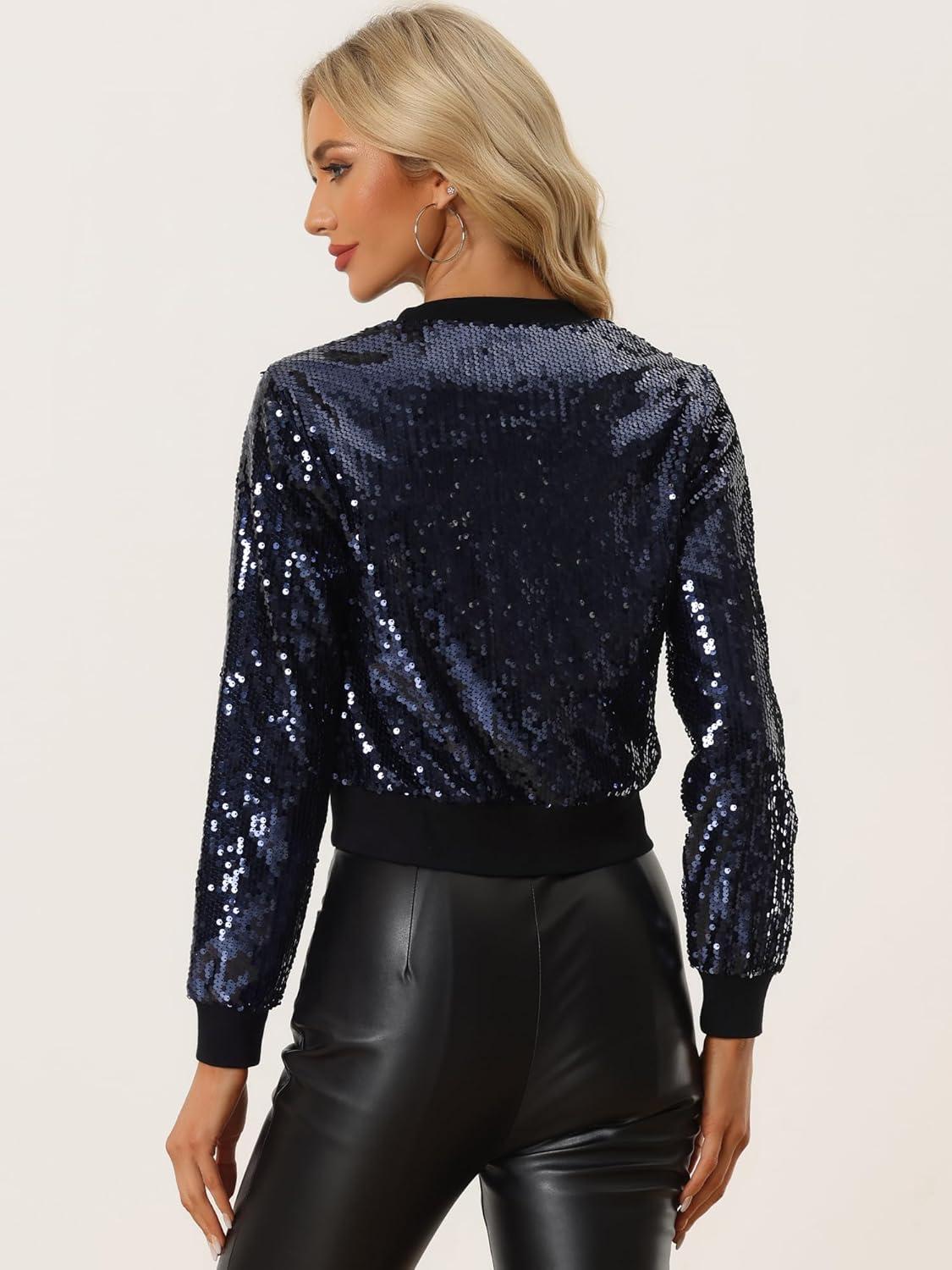Allegra K Women Sequin Bomber Jackets Halloween Sparkly Long Sleeve Zip Front Shiny Cropped Jacket Glitter Party Disco Outfit(Navy)
