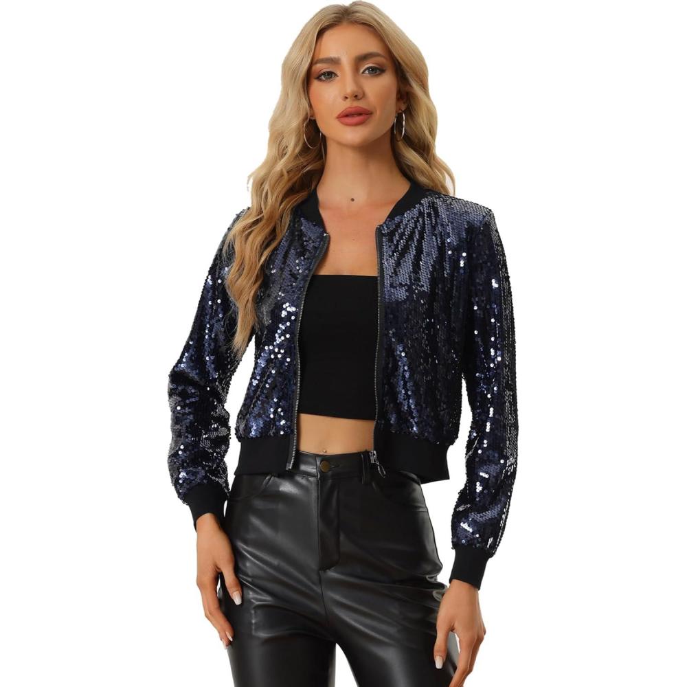 imageAllegra K Women Sequin Bomber Jackets Halloween Sparkly Long Sleeve Zip Front Shiny Cropped Jacket Glitter Party Disco OutfitNavy
