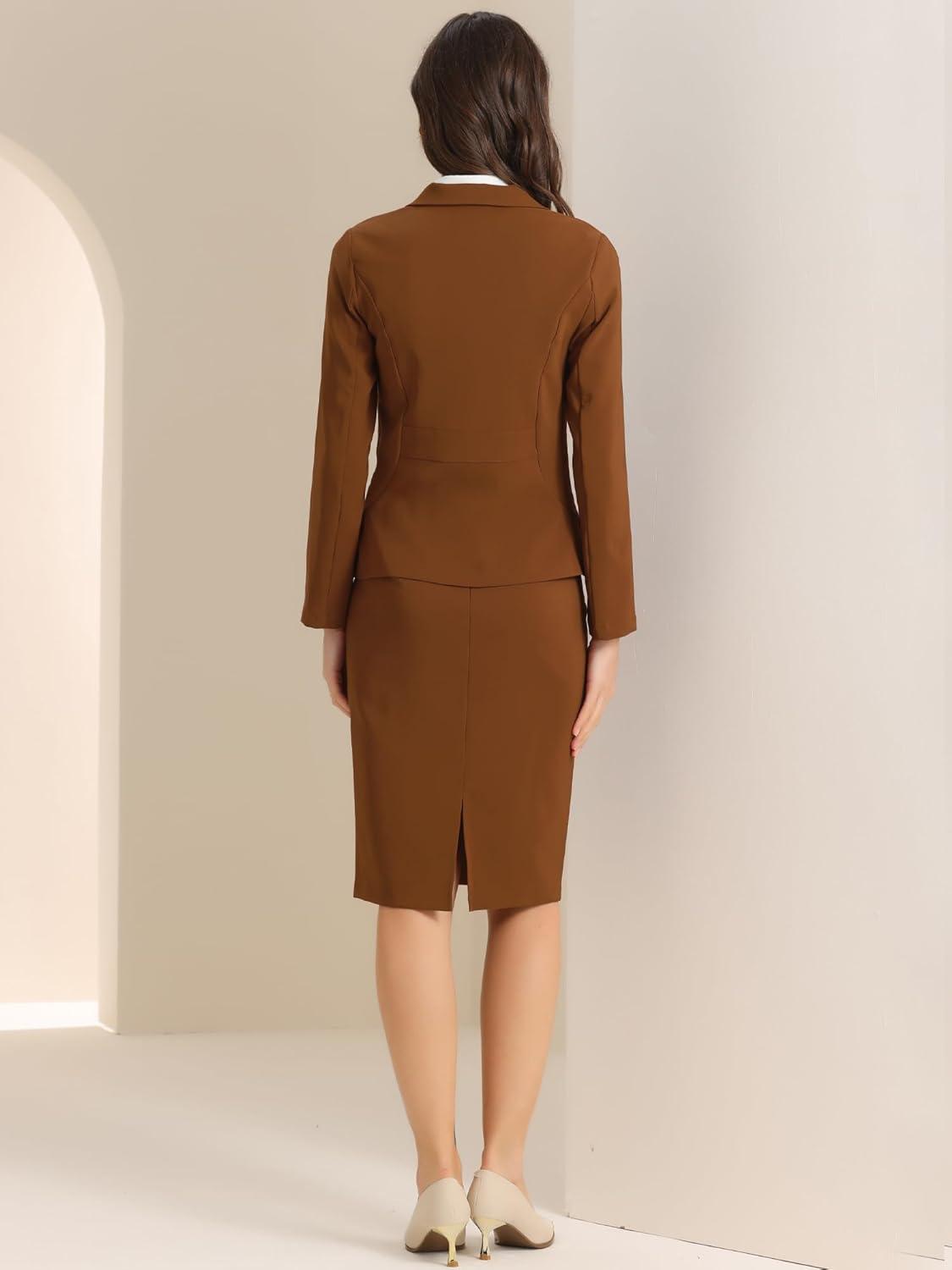 Allegra K Women’s 2 Piece Skirt Suit Set Business Long Sleeve Blazer and Pencil Skirt Outfits(Brown)