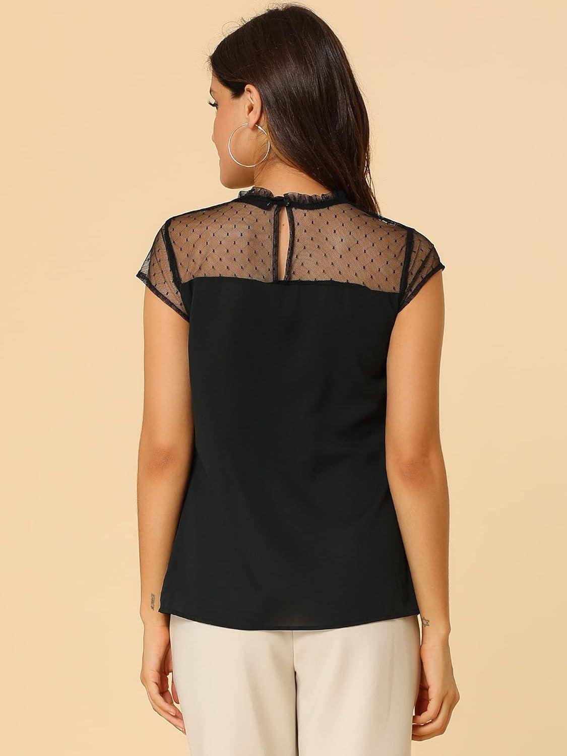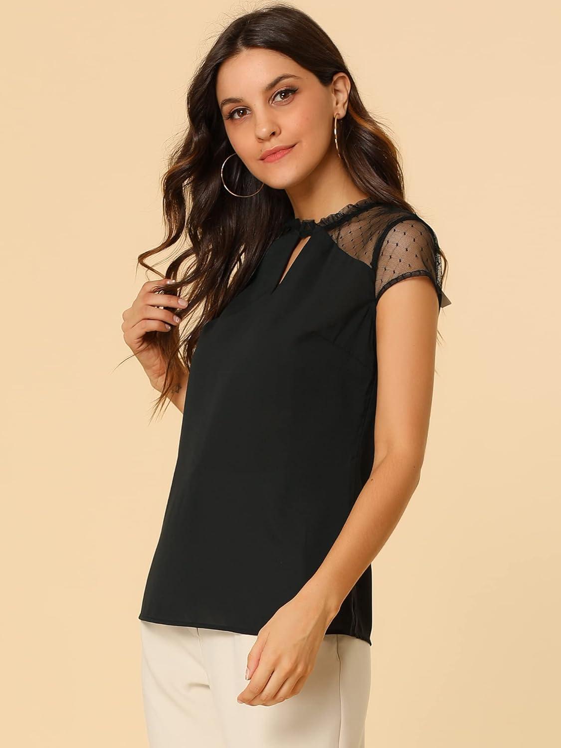 Allegra K Women’s 2023 Summer Keyhole Neck Ruffle Mesh Sheer Lace Panel Elegant Blouse Top(Black)