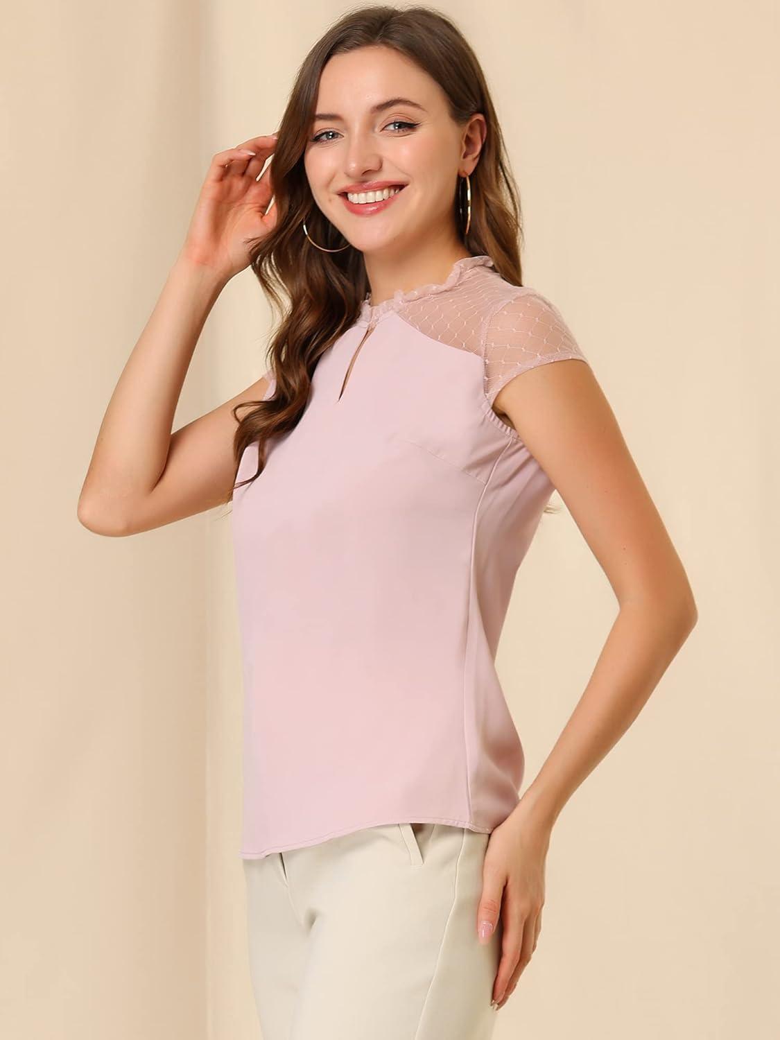 Allegra K Women’s 2023 Summer Keyhole Neck Ruffle Mesh Sheer Lace Panel Elegant Blouse Top(Pink)