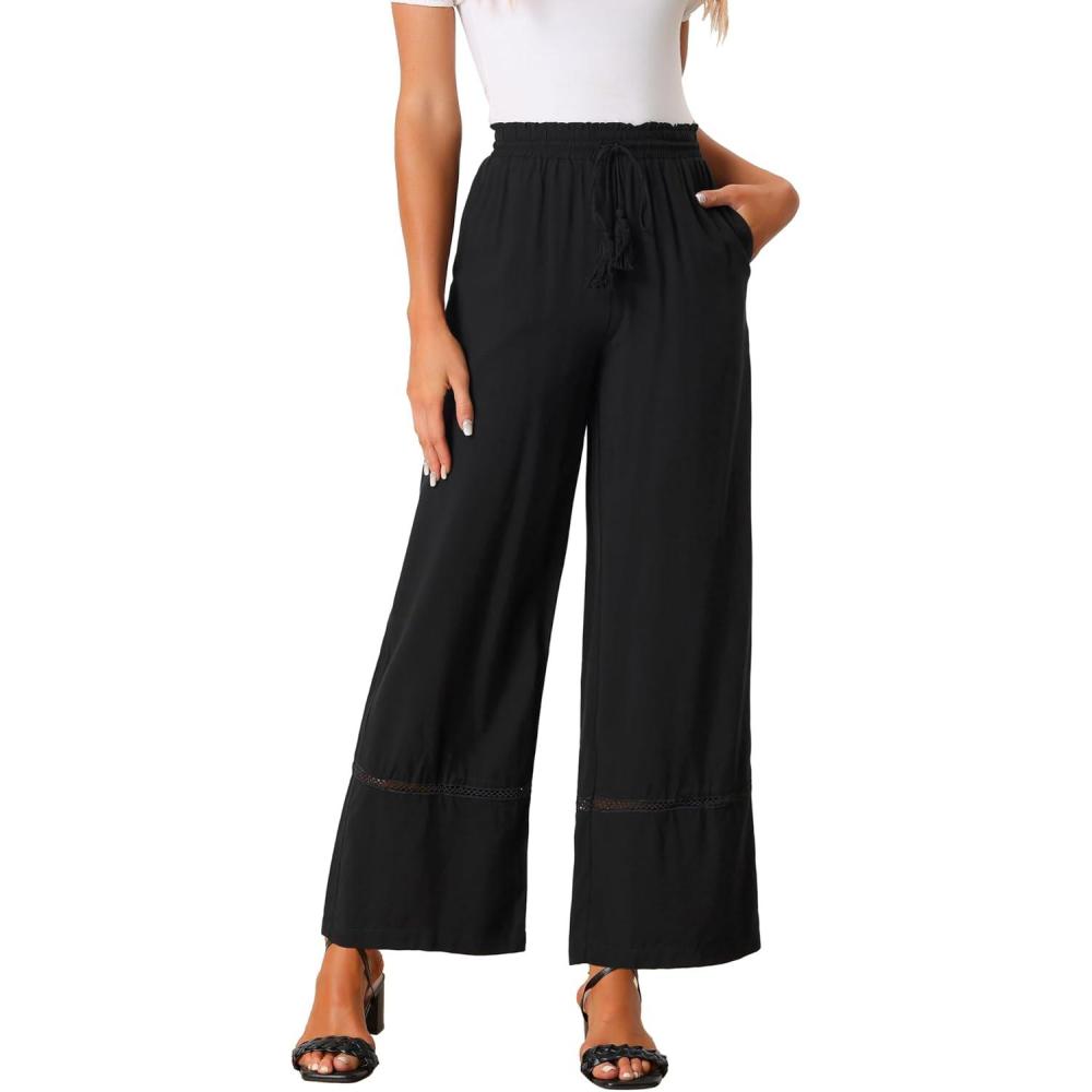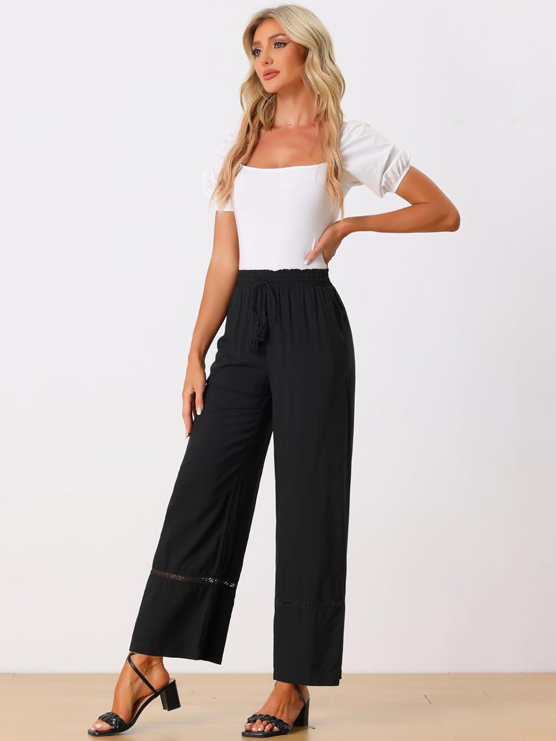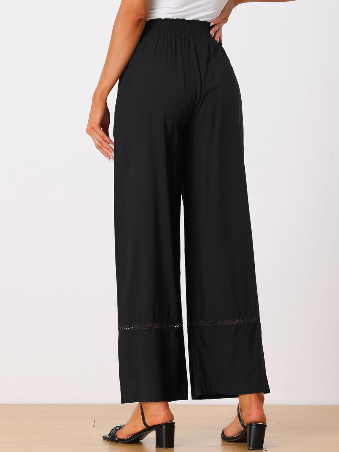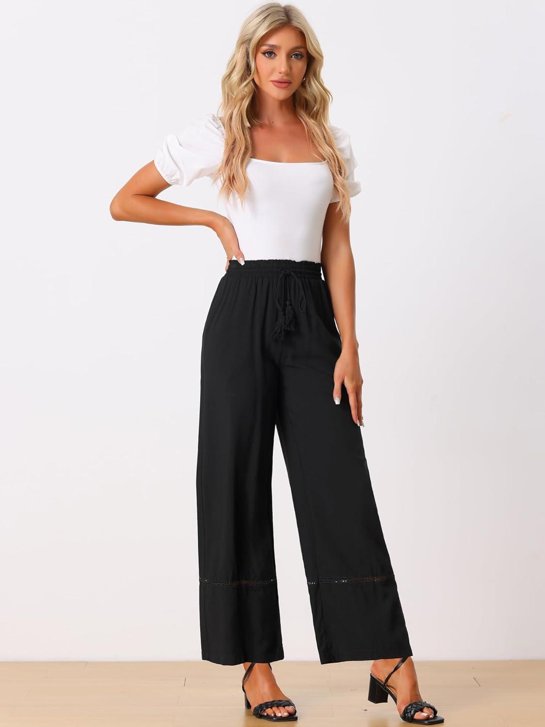 Allegra K Women's 2025 Summer Casual Pants Loose High Waist Drawstring Wide Leg Palazzo Trousers with Pockets(Black)