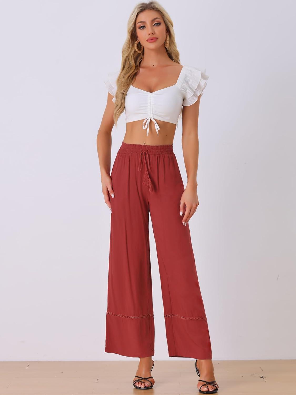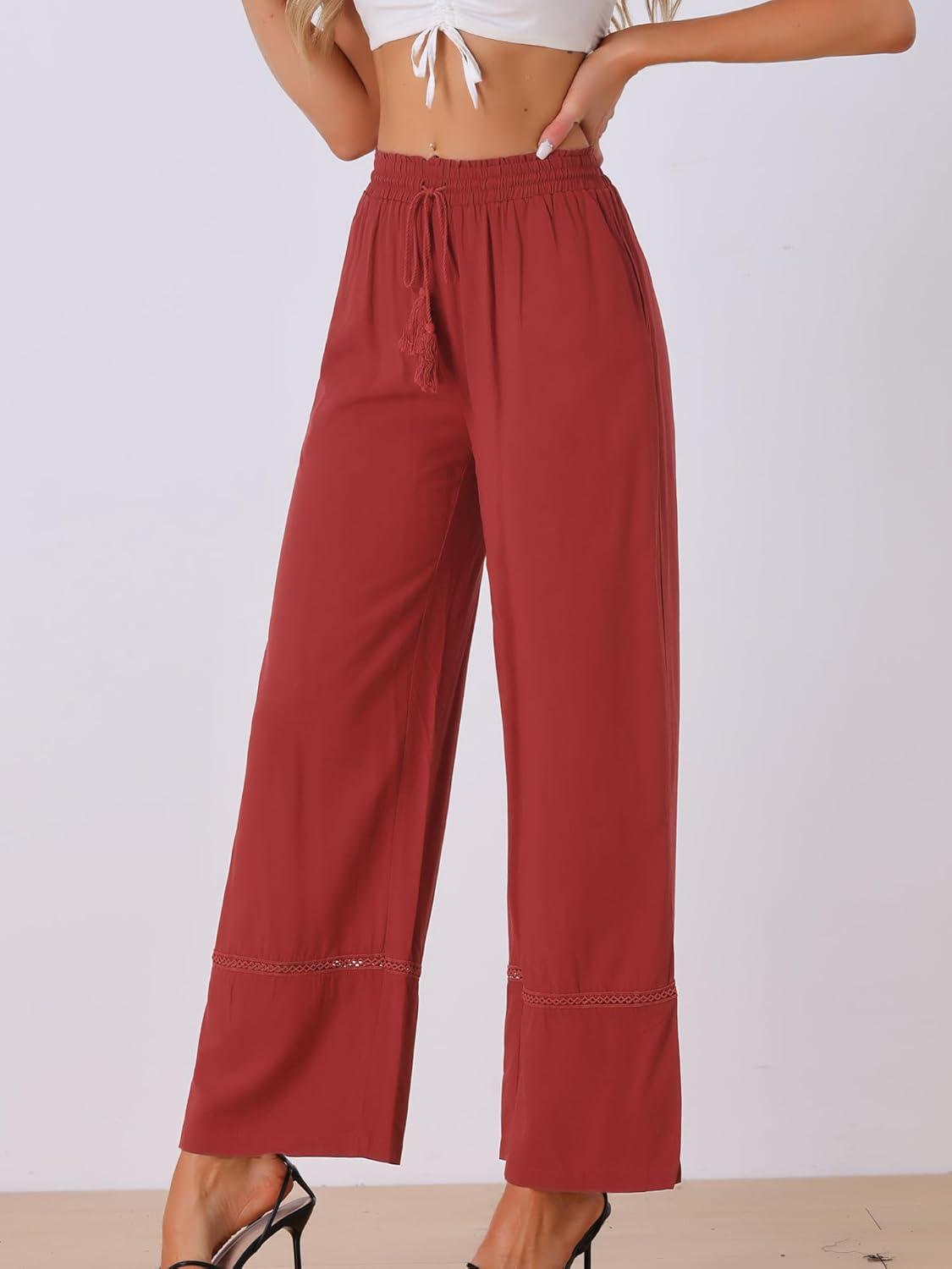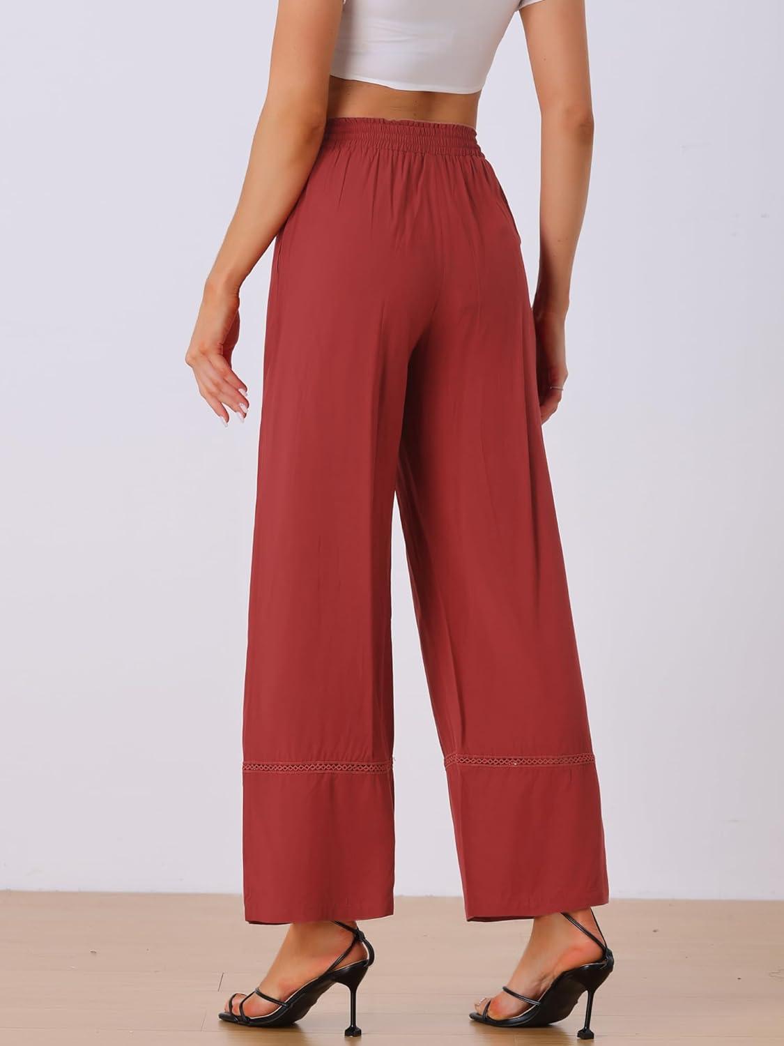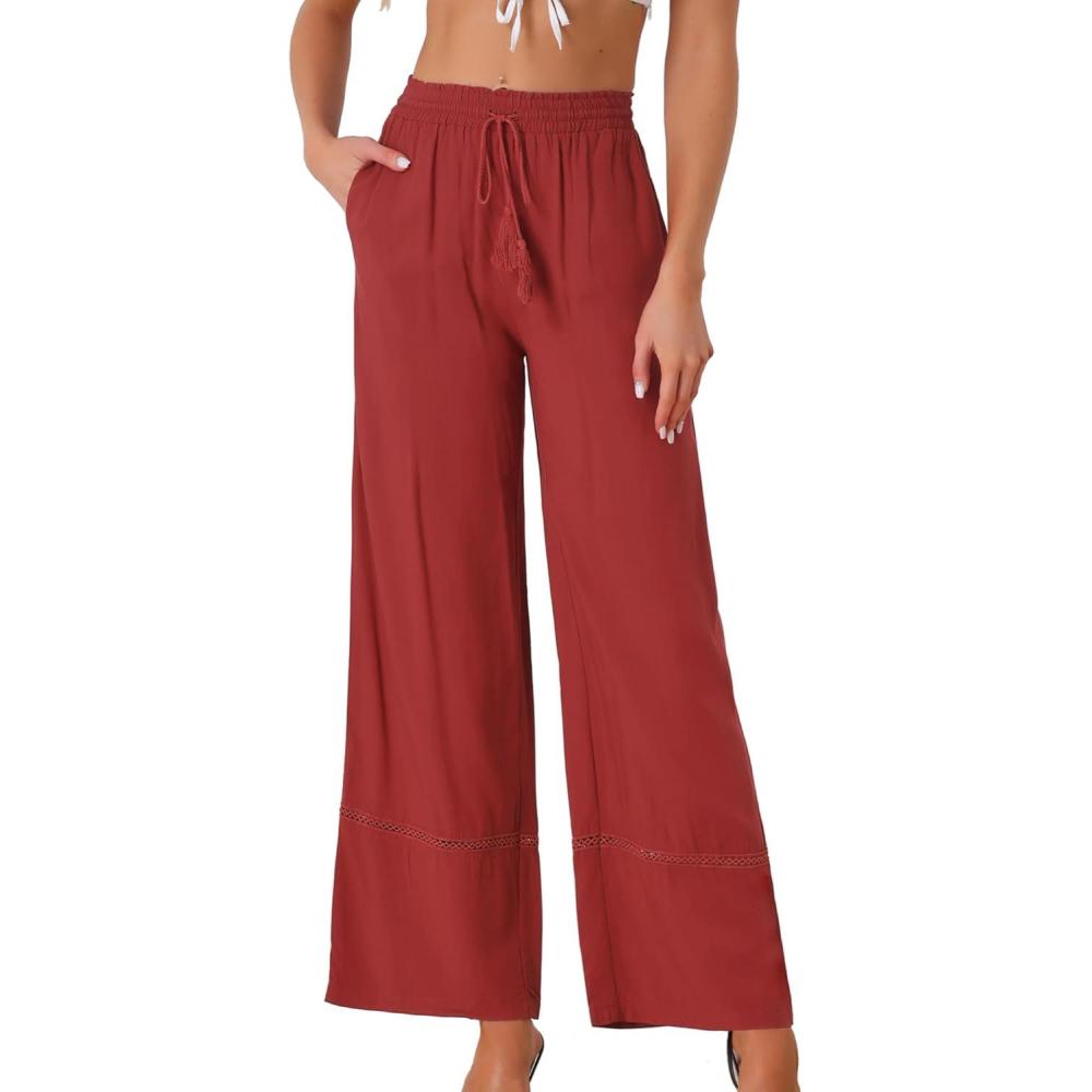 Allegra K Women's 2025 Summer Casual Pants Loose High Waist Drawstring Wide Leg Palazzo Trousers with Pockets(Dark Red)