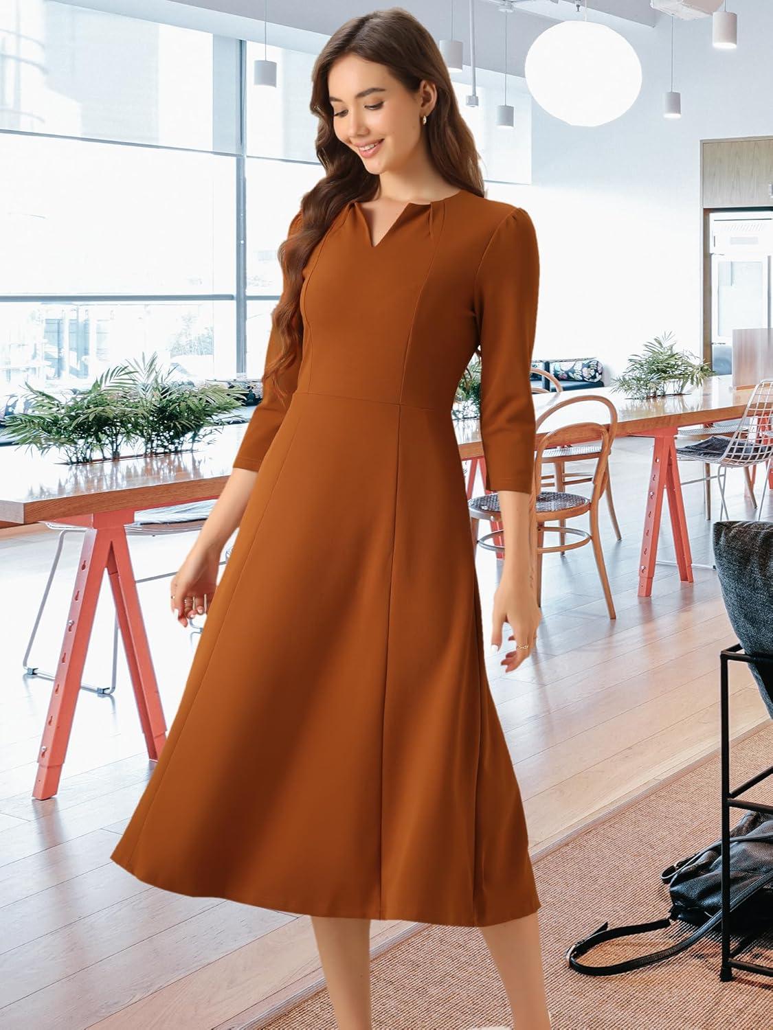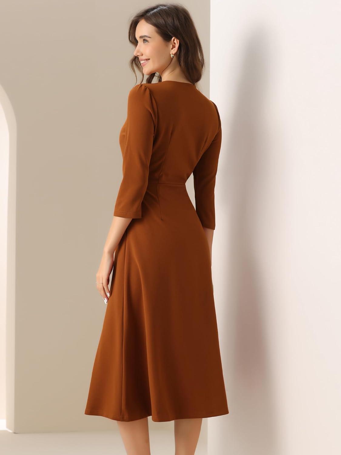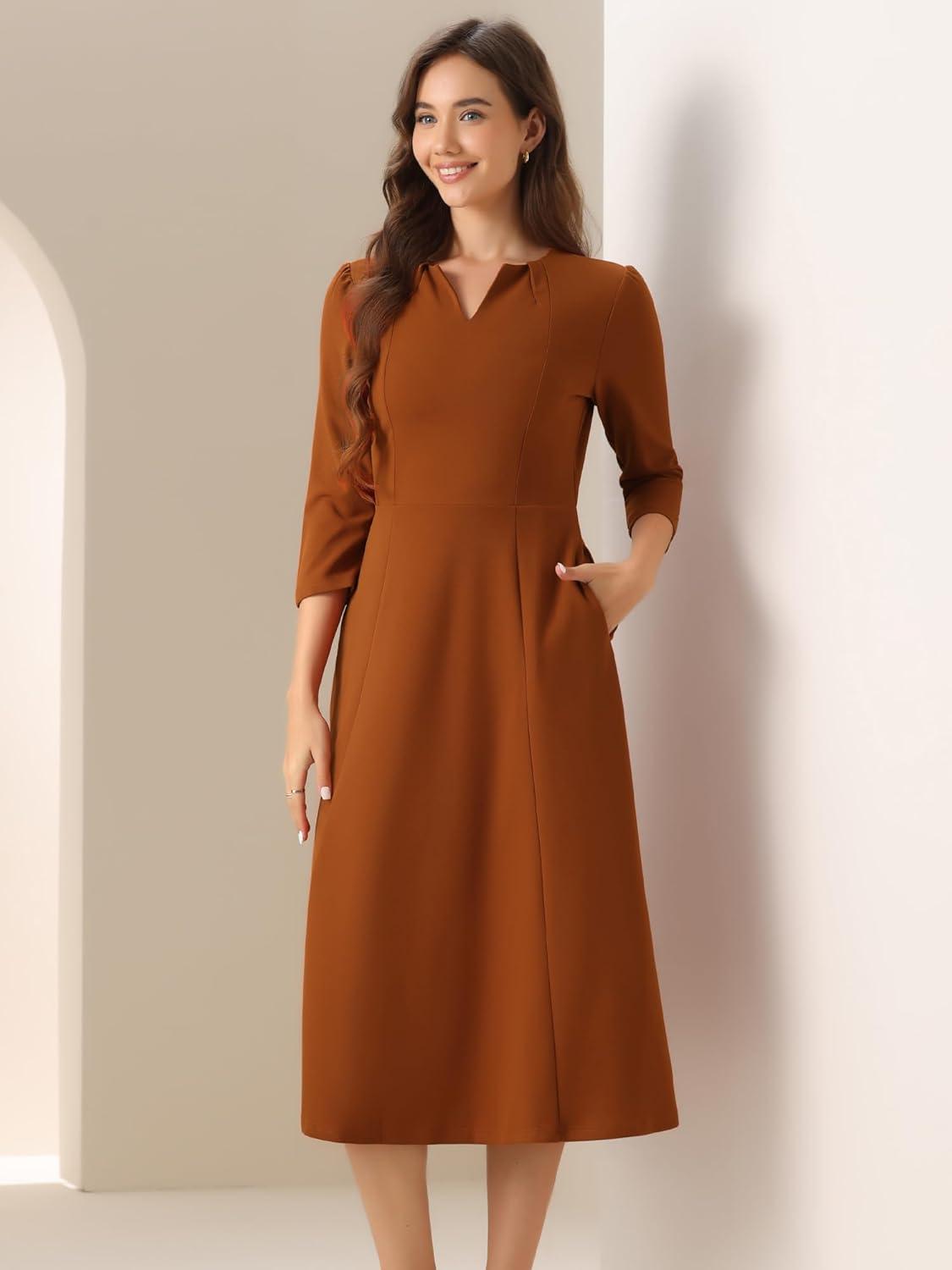 Allegra K Women’s 3/4 Sleeve Dresses V Neck Elegant A-Line Work Business Formal Midi Dress with Pockets(Caramel)