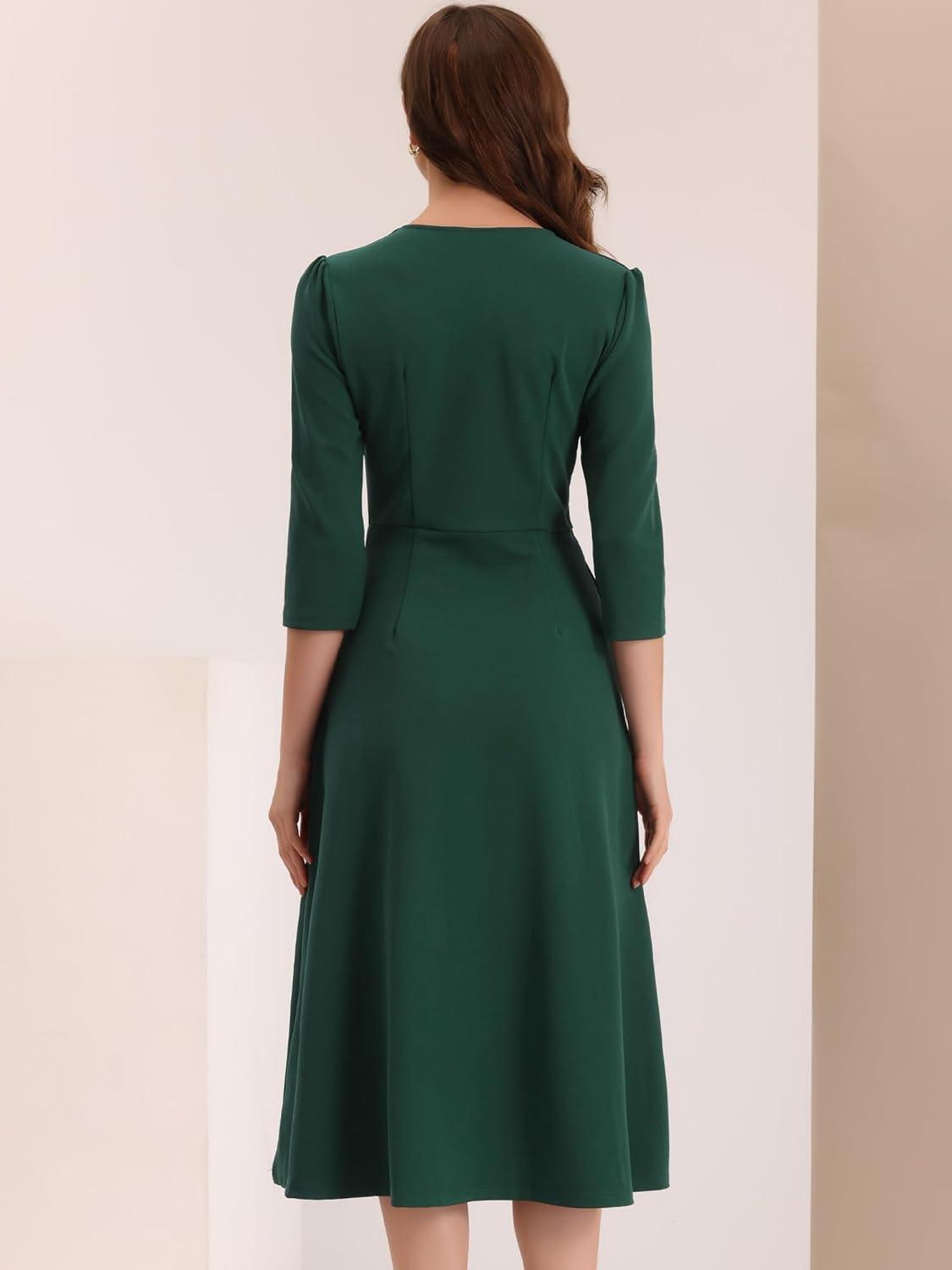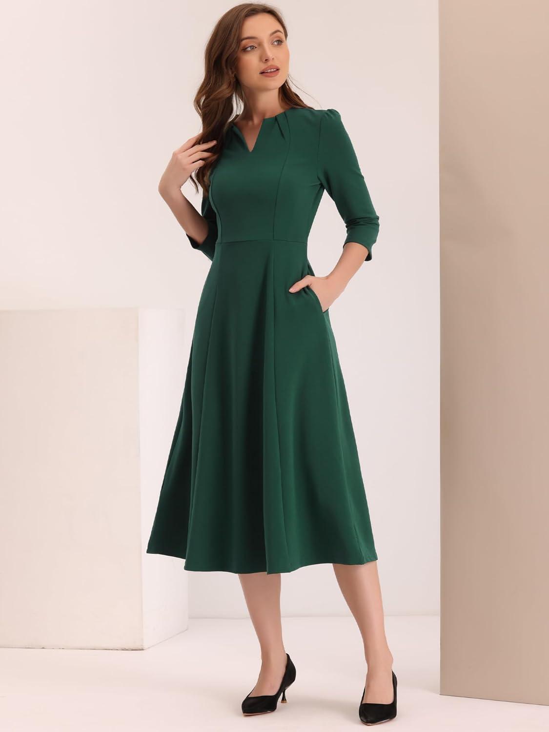 Allegra K Women’s 3/4 Sleeve Dresses V Neck Elegant A-Line Work Business Formal Midi Dress with Pockets(Dark Green)