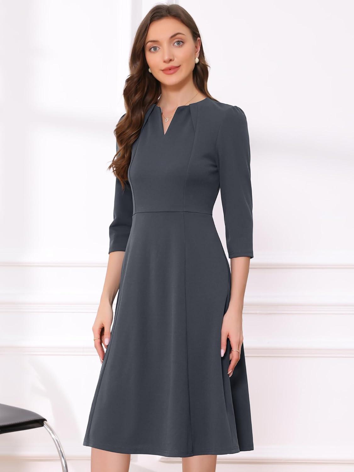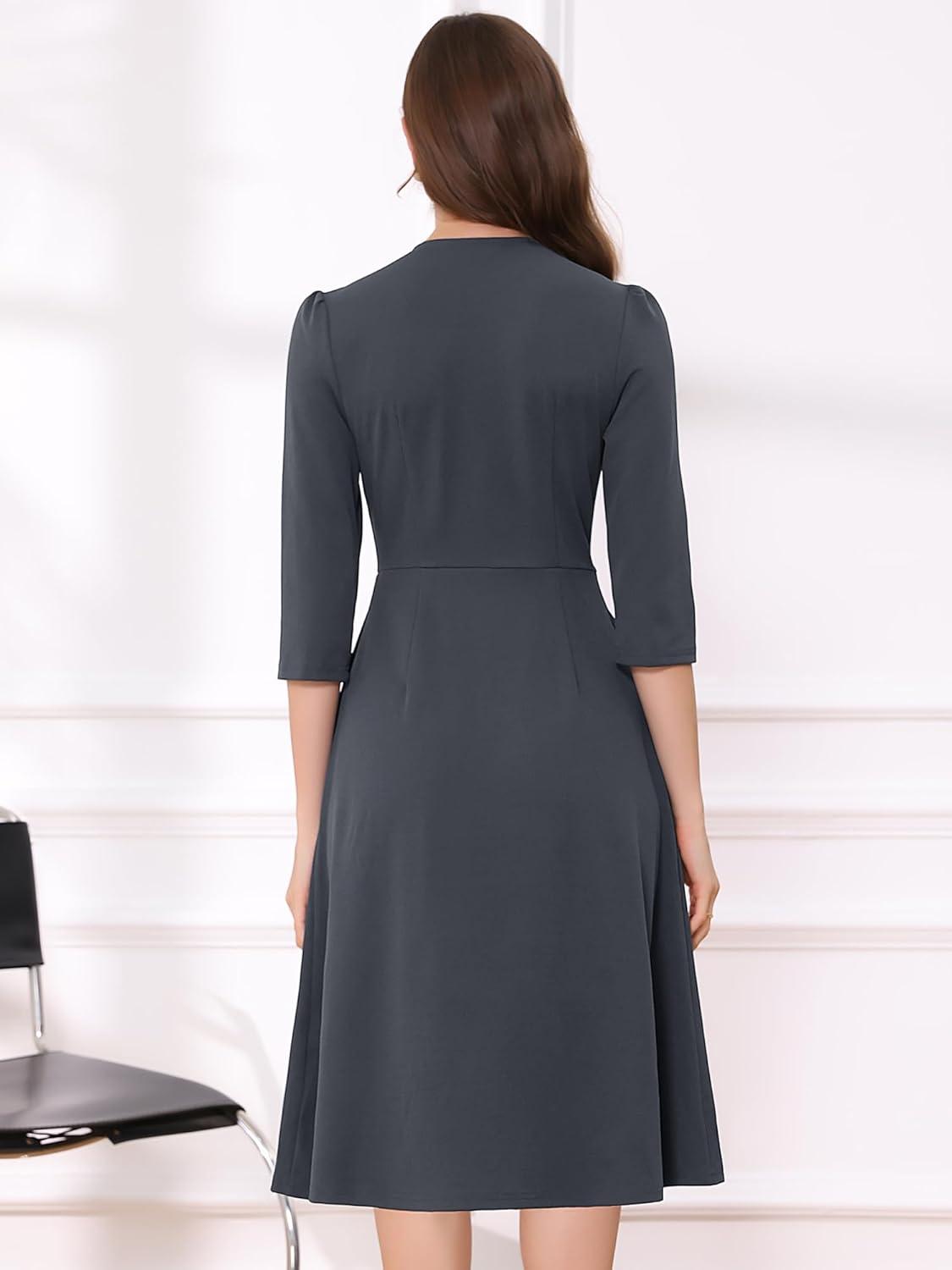 Allegra K Women's 3/4 Sleeve Dresses V Neck Elegant A-Line Work Business Formal Midi Dress with Pockets(Dark Grey)