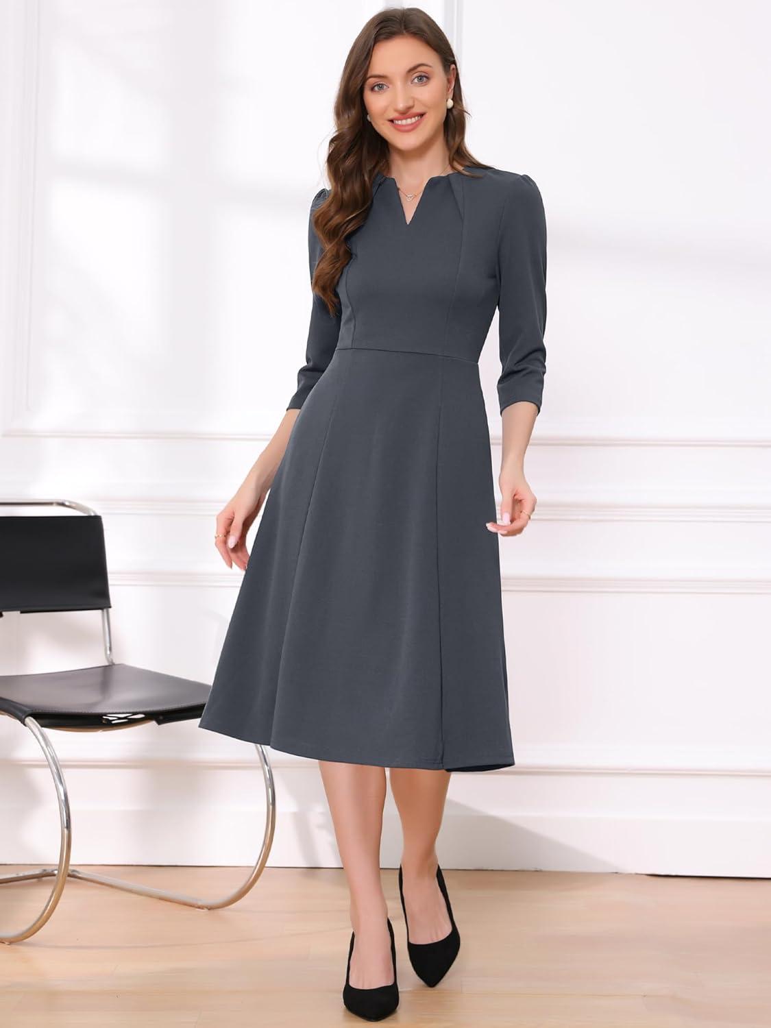 Allegra K Women’s 3/4 Sleeve Dresses V Neck Elegant A-Line Work Business Formal Midi Dress with Pockets(Dark Grey)