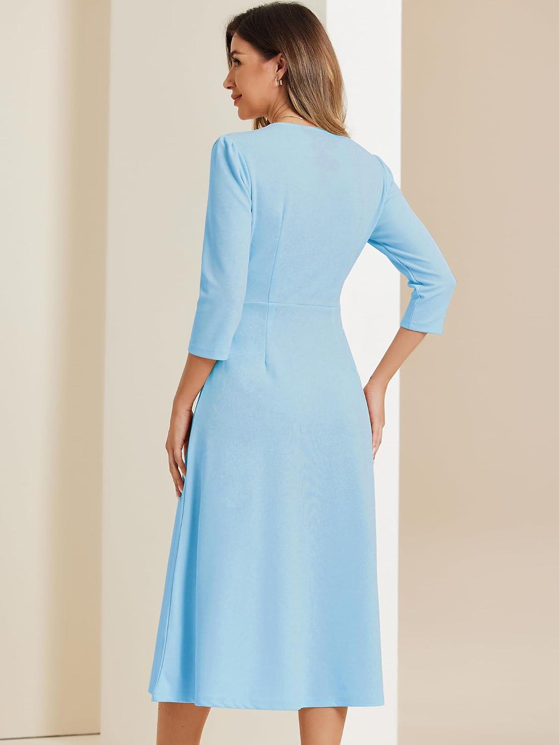 Allegra K Women’s 3/4 Sleeve Dresses V Neck Elegant A-Line Work Business Formal Midi Dress with Pockets(Light Blue)