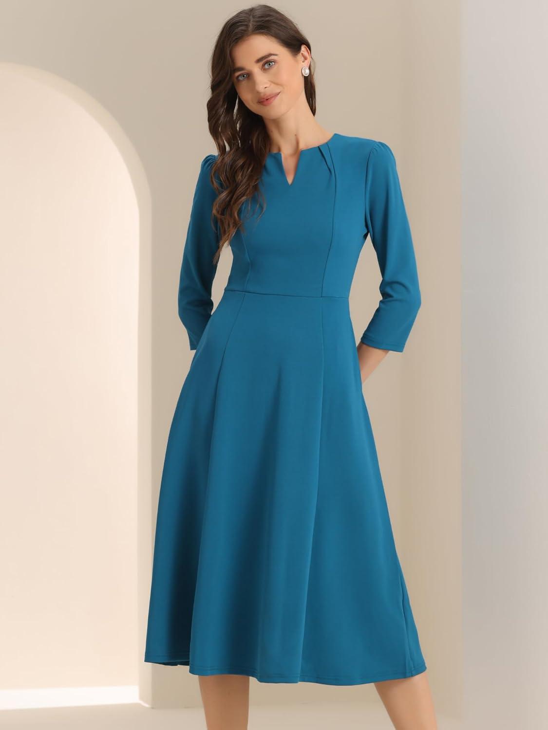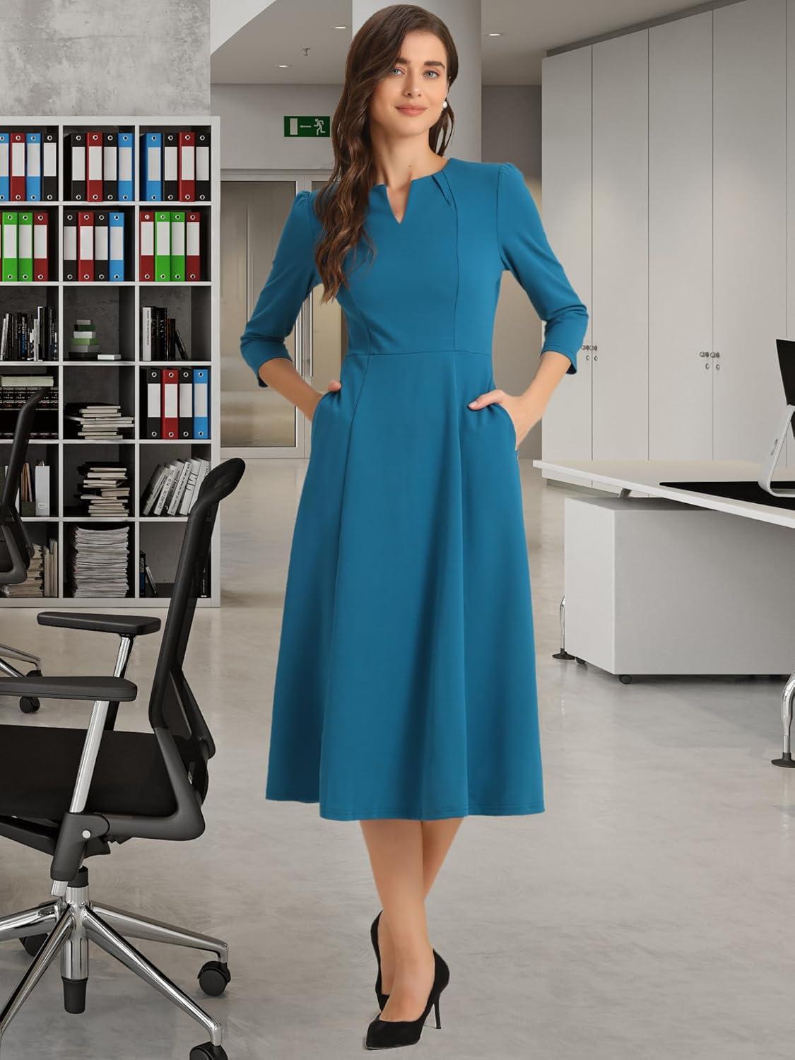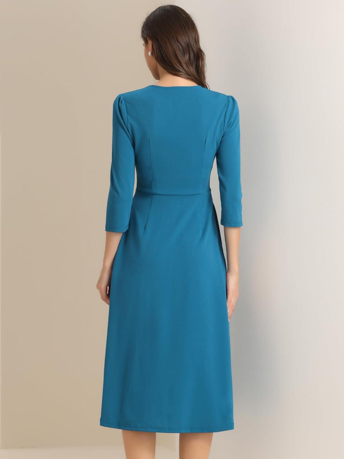 Allegra K Women’s 3/4 Sleeve Dresses V Neck Elegant A-Line Work Business Formal Midi Dress with Pockets(Peacock Blue)