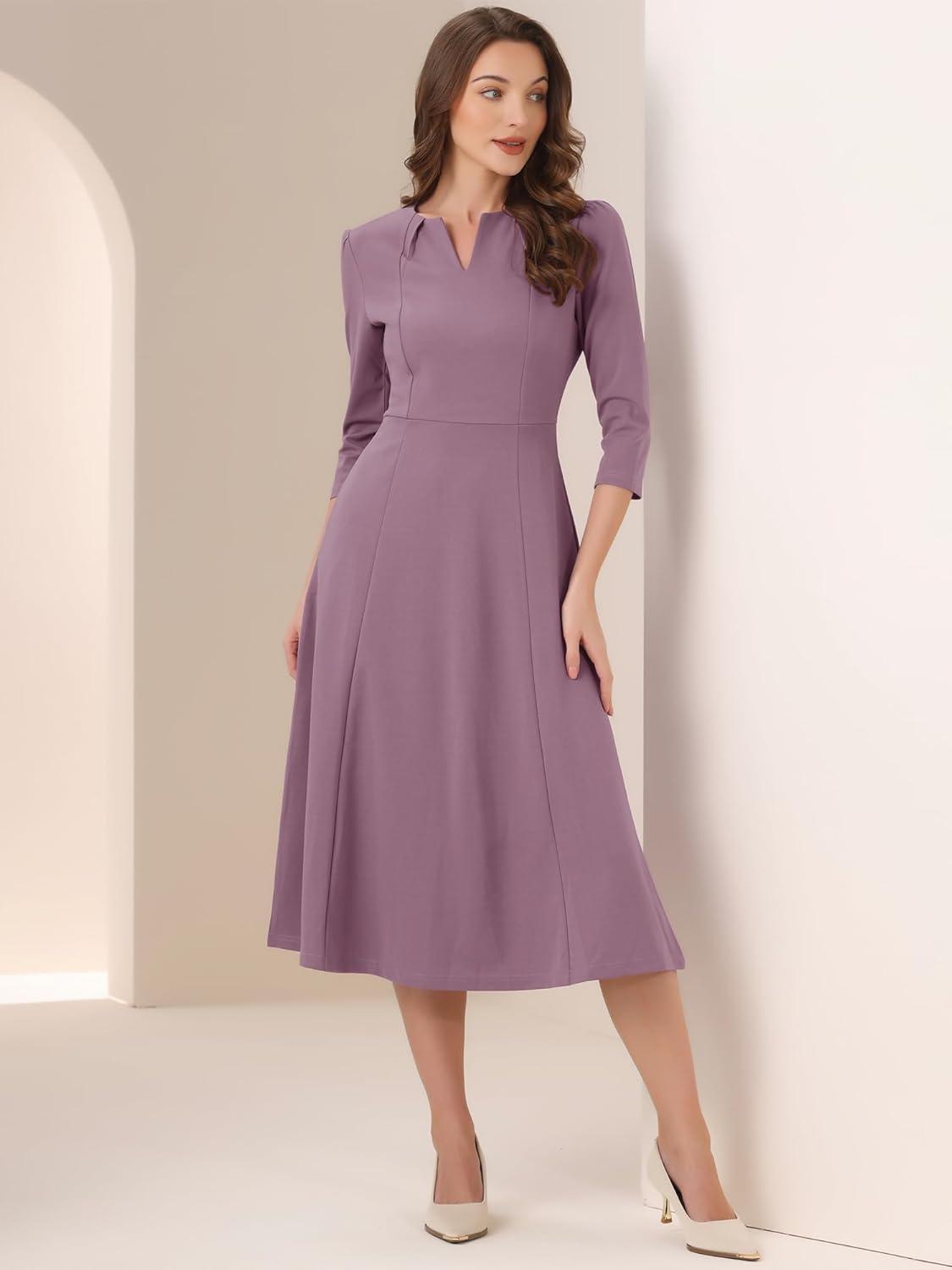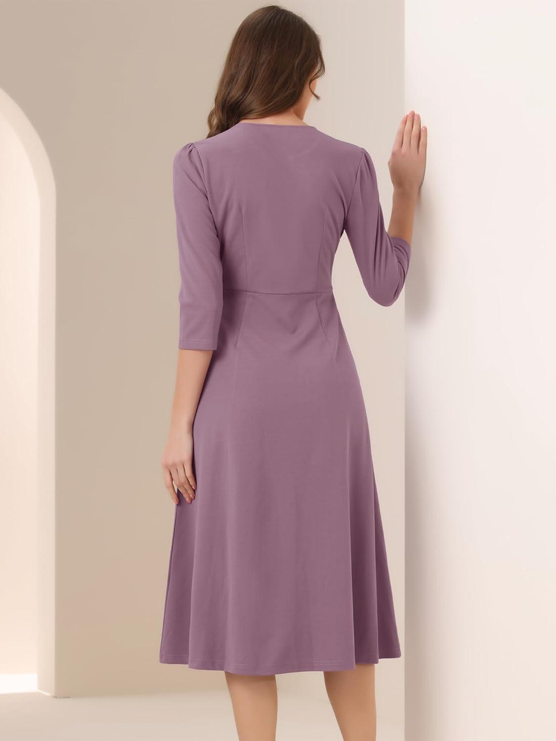 Allegra K Women’s 3/4 Sleeve Dresses V Neck Elegant A-Line Work Business Formal Midi Dress with Pockets(Purple Grey)
