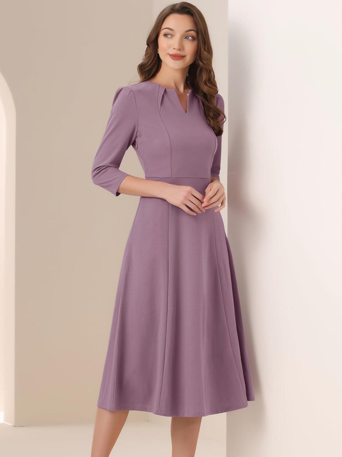 Allegra K Women's 3/4 Sleeve Dresses V Neck Elegant A-Line Work Business Formal Midi Dress with Pockets(Purple Grey)