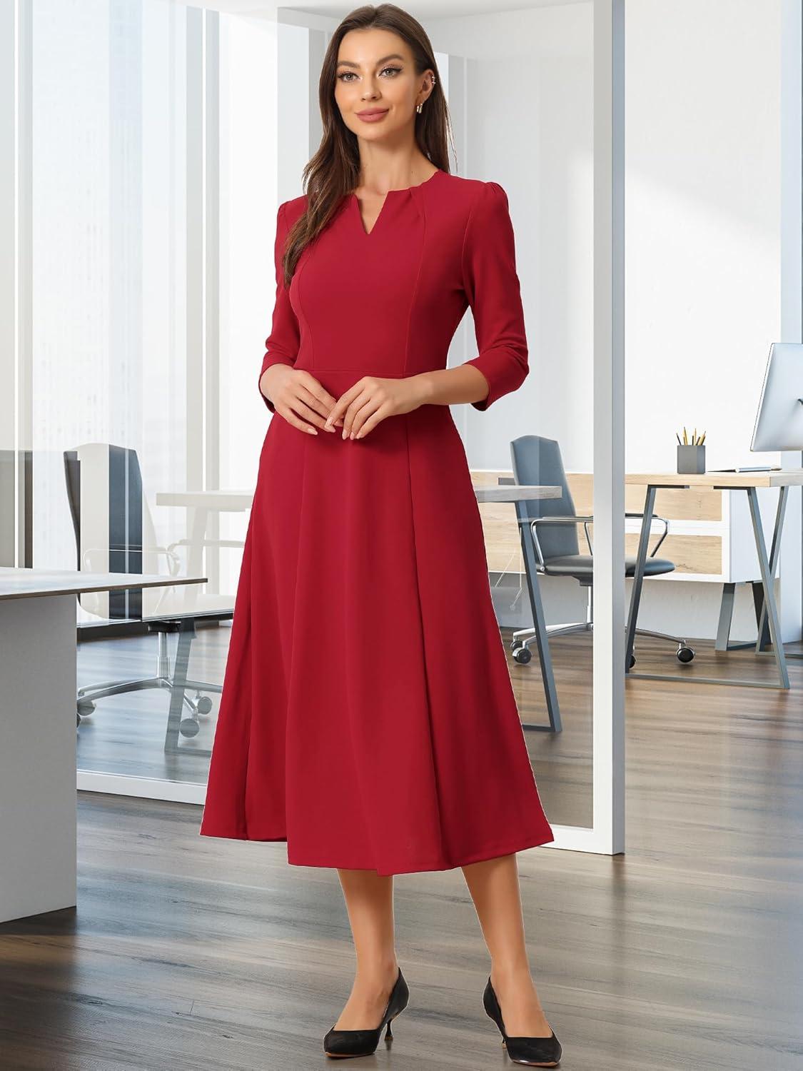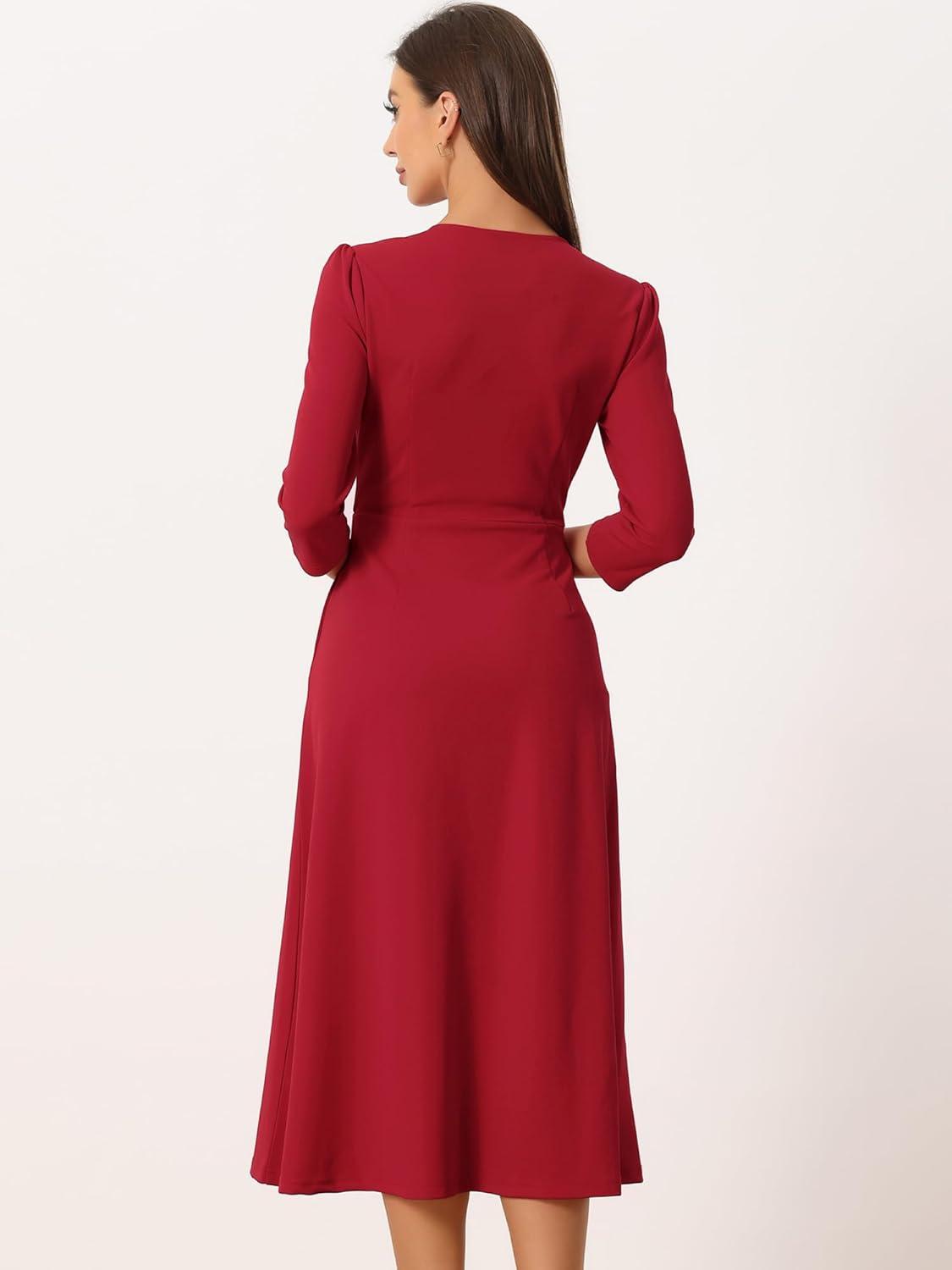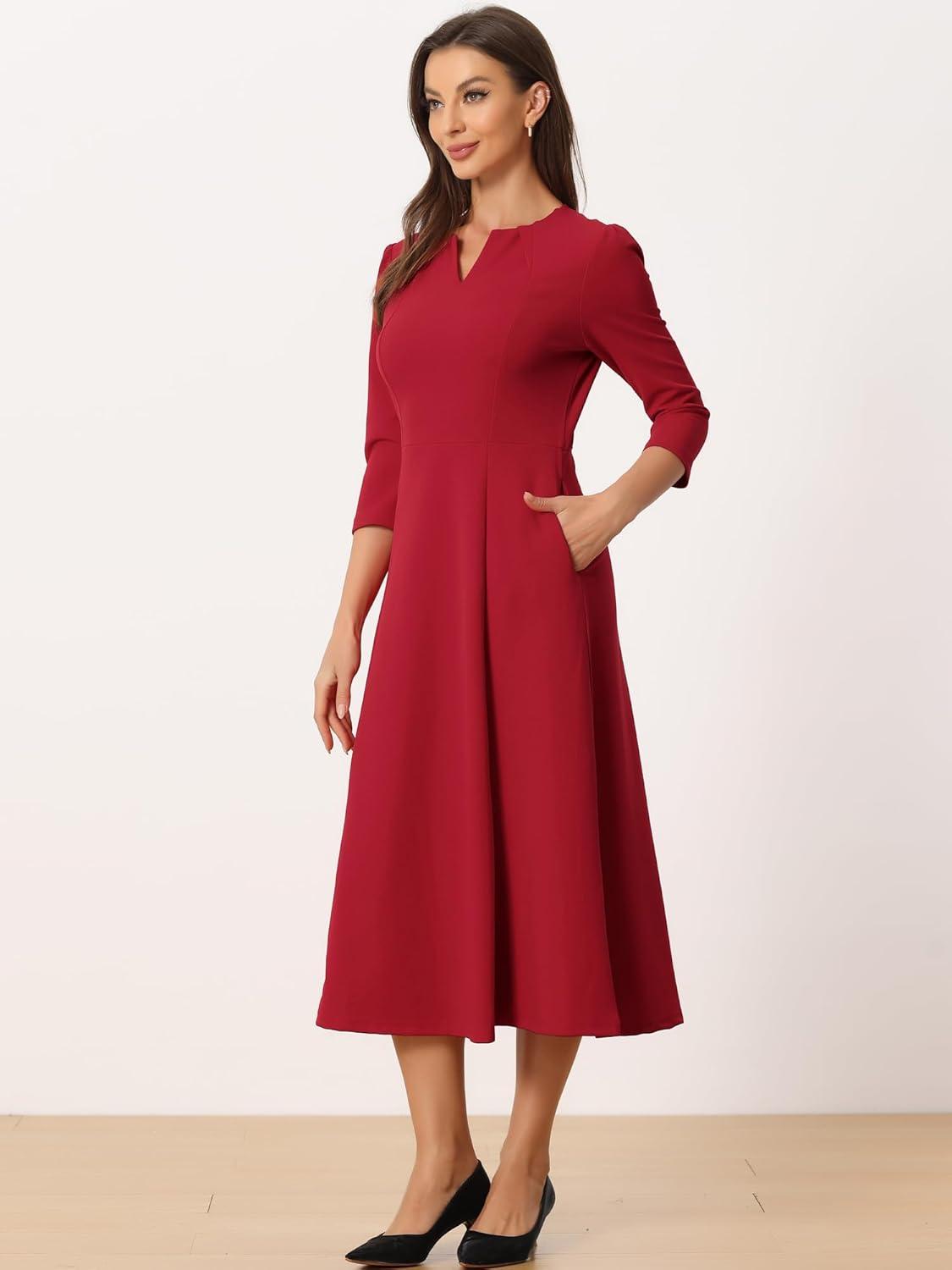 Allegra K Women’s 3/4 Sleeve Dresses V Neck Elegant A-Line Work Business Formal Midi Dress with Pockets(Red)