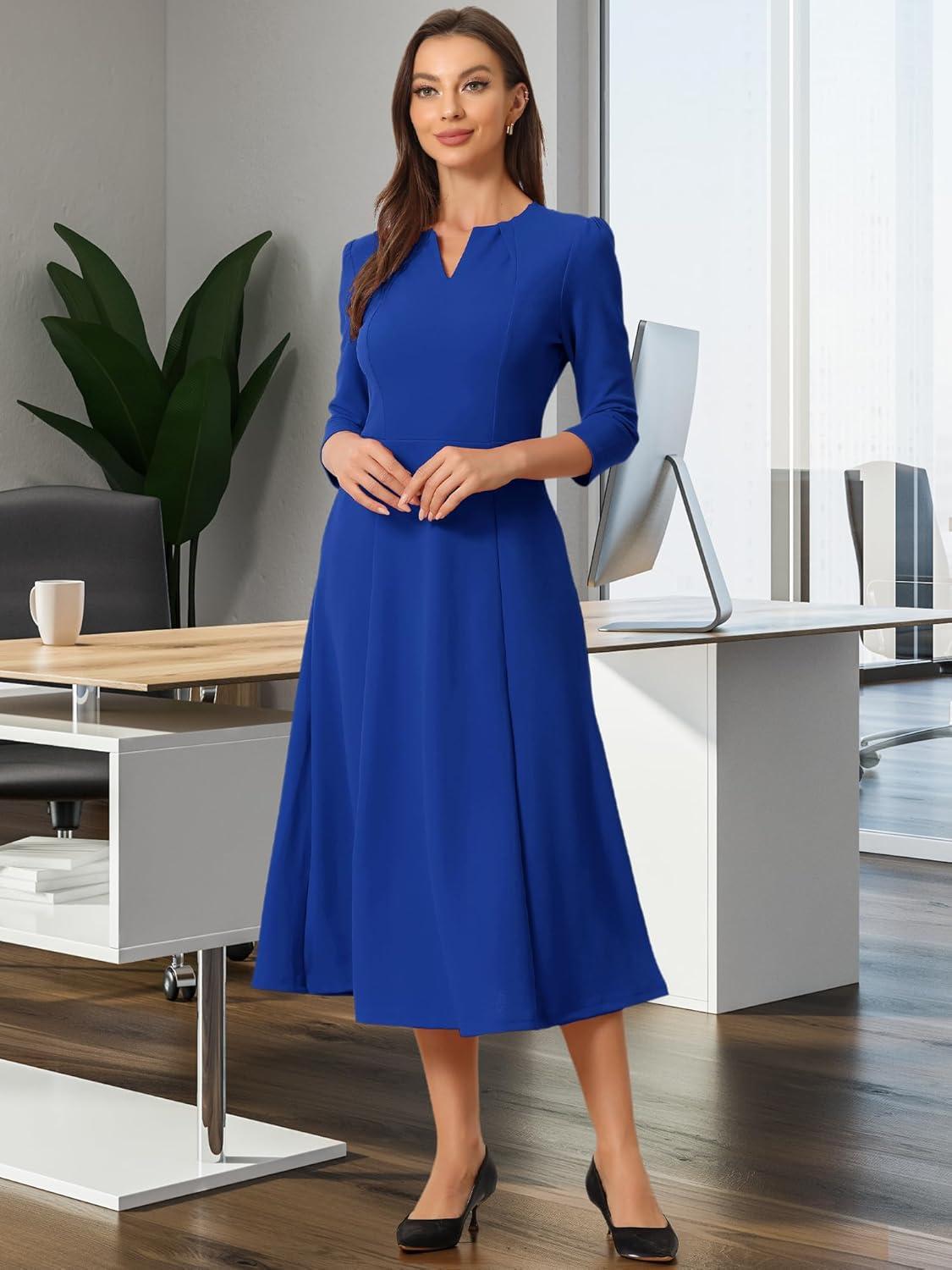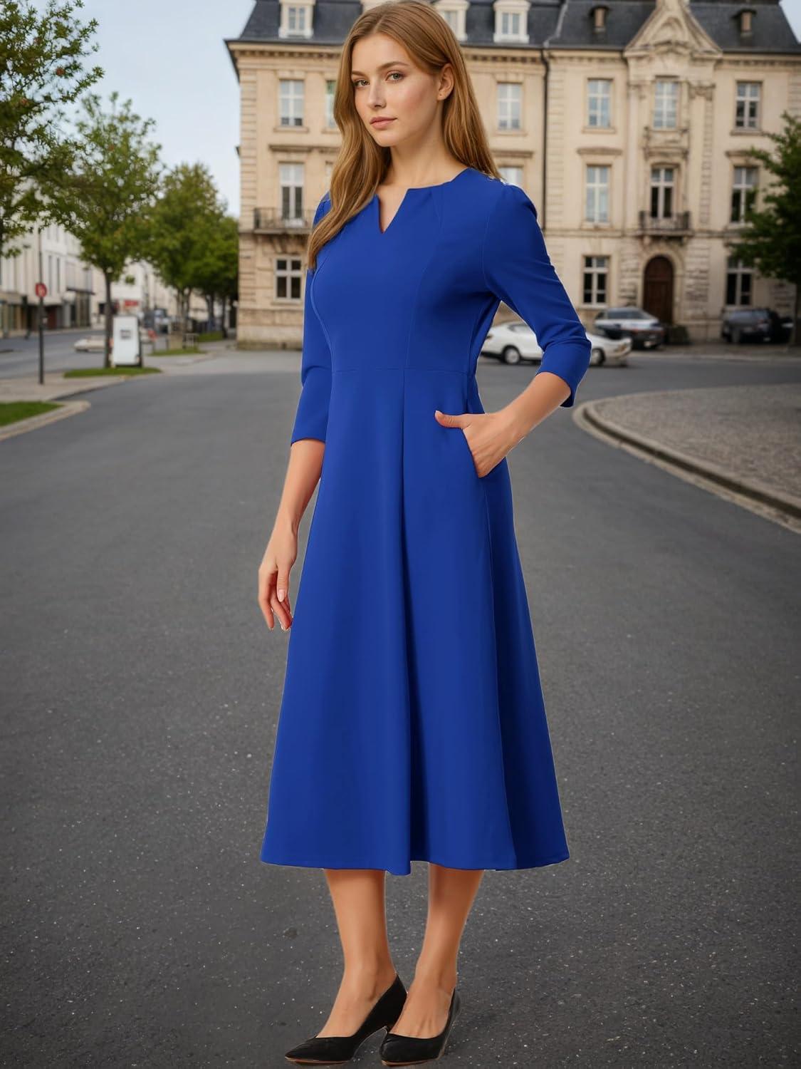 Allegra K Women’s 3/4 Sleeve Dresses V Neck Elegant A-Line Work Business Formal Midi Dress with Pockets(Royal Blue)