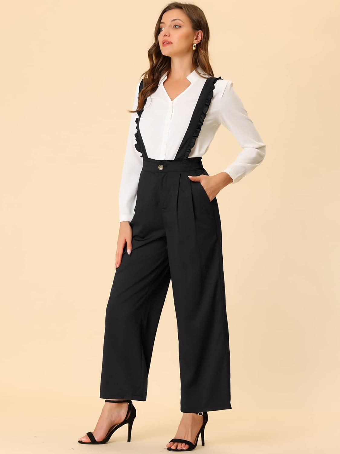 Allegra K Women's Ankle Pants High Waist Ruffled Suspender Overalls Office Wide Leg Trousers Medium Black