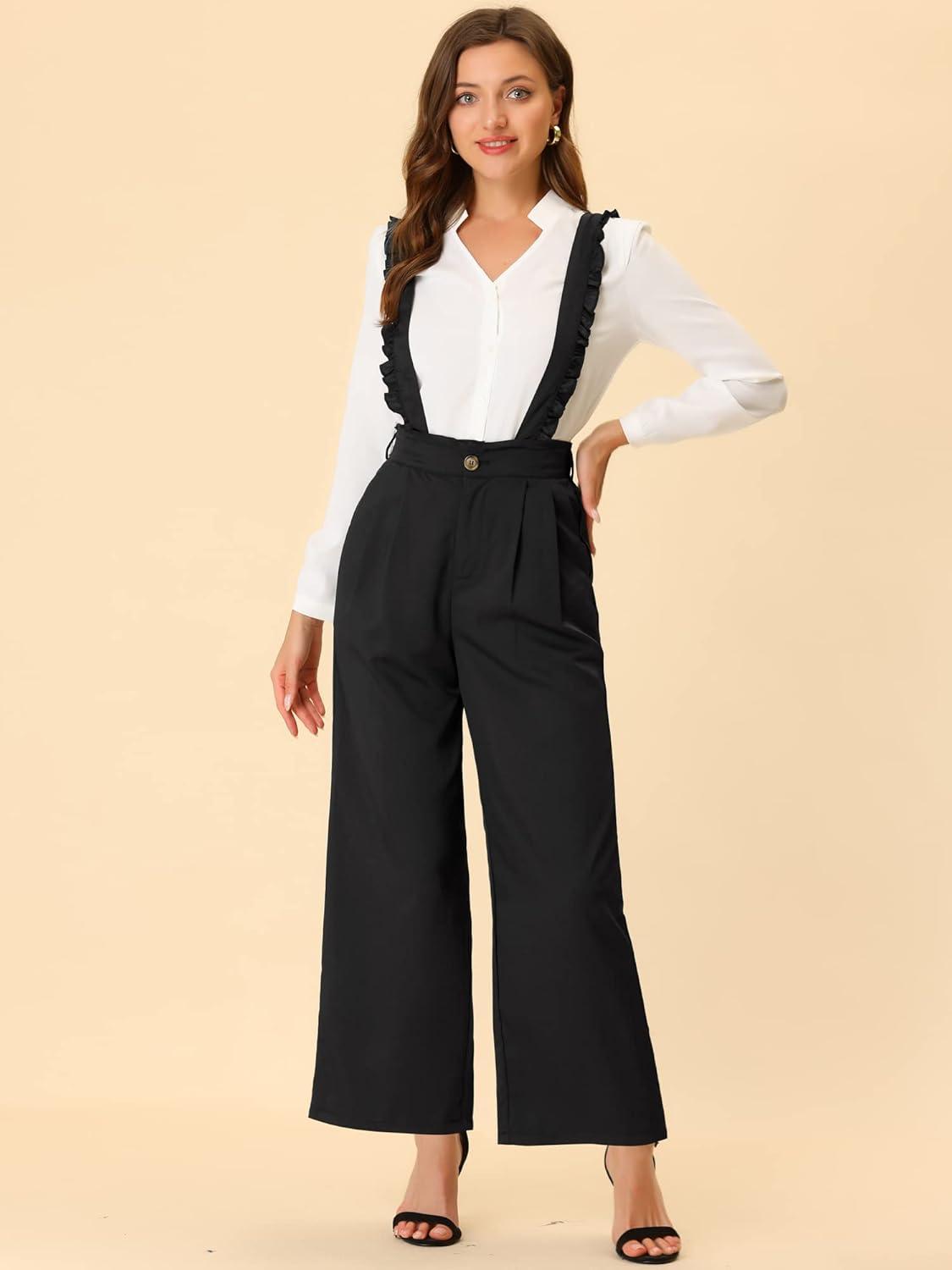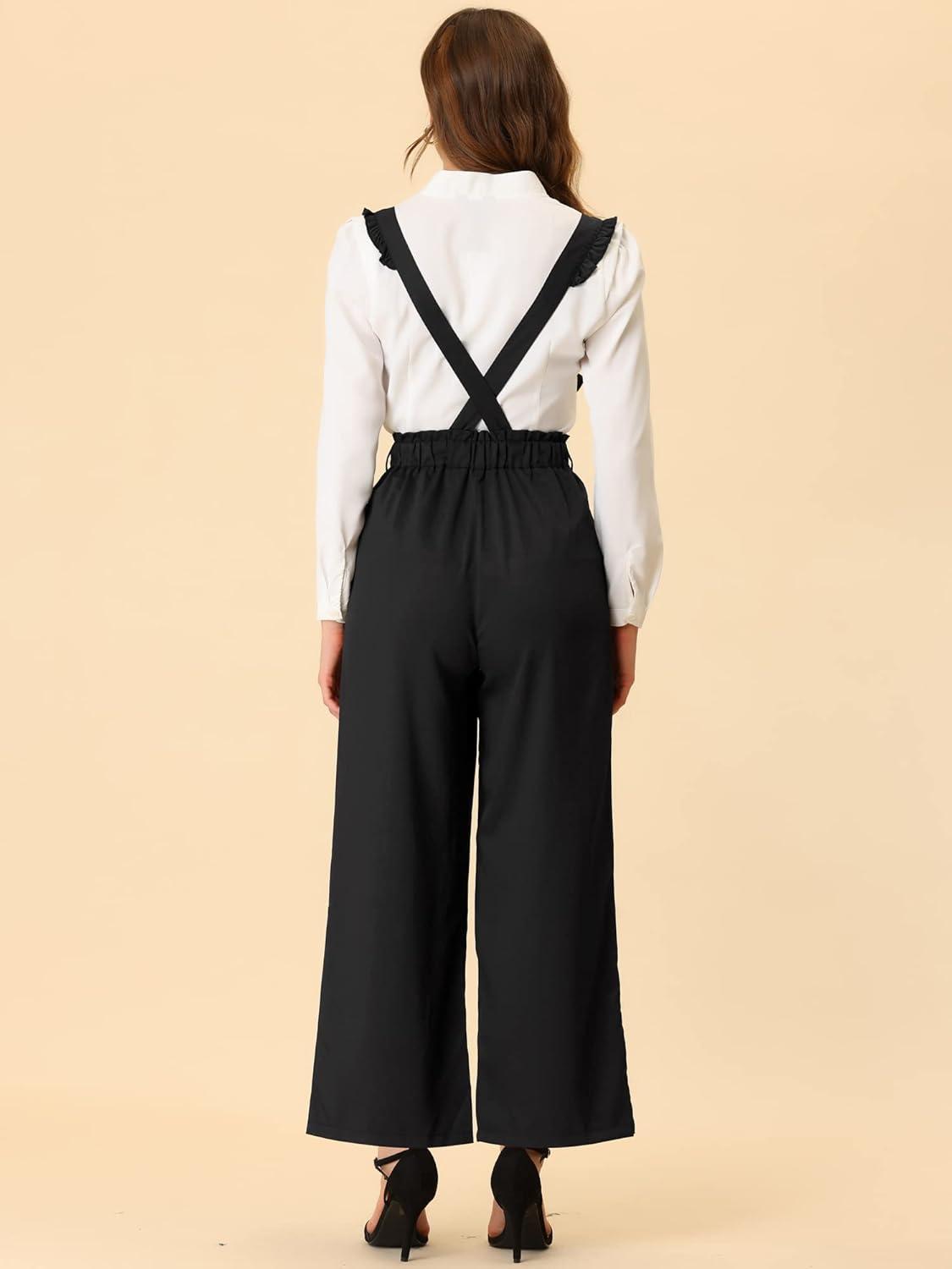 Allegra K Women’s Ankle Pants High Waist Ruffled Suspender Overalls Office Wide Leg Trousers Medium Black