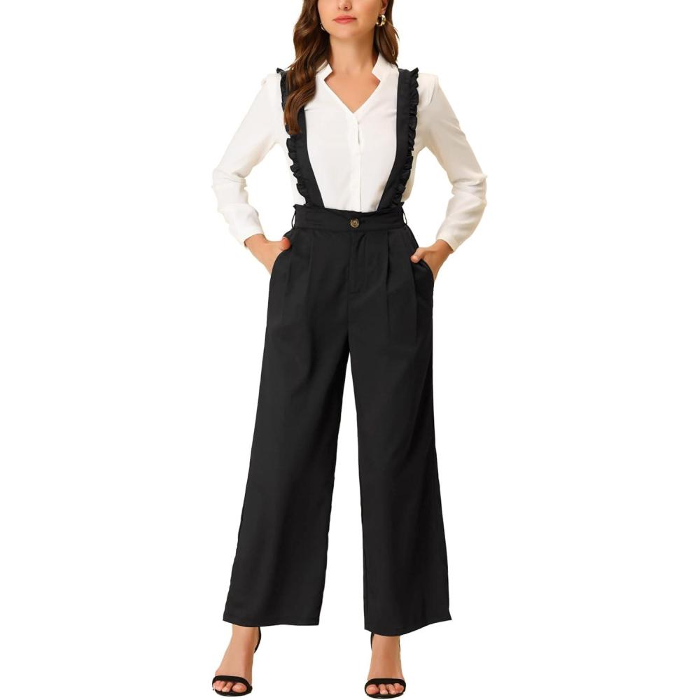 imageAllegra K Womens Ankle Pants High Waist Ruffled Suspender Overalls Office Wide Leg Trousers Medium Black