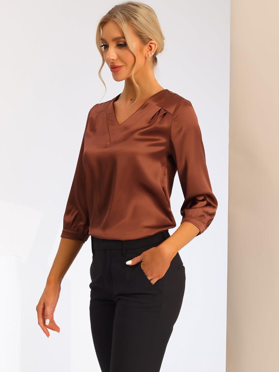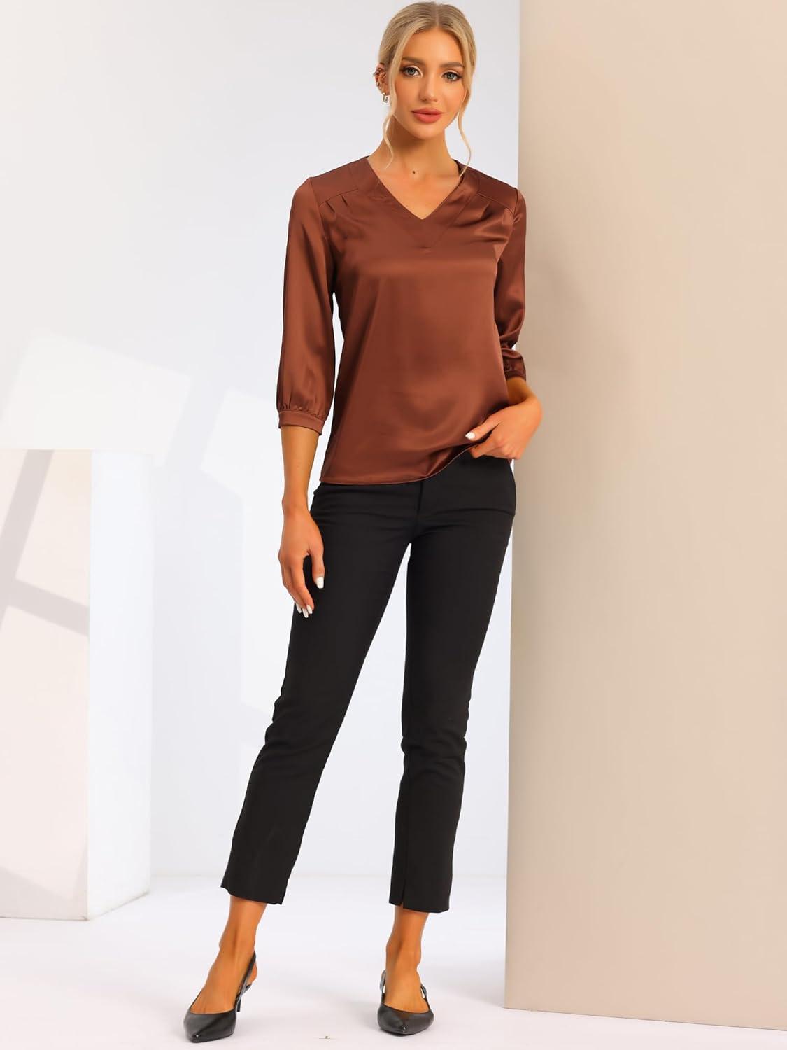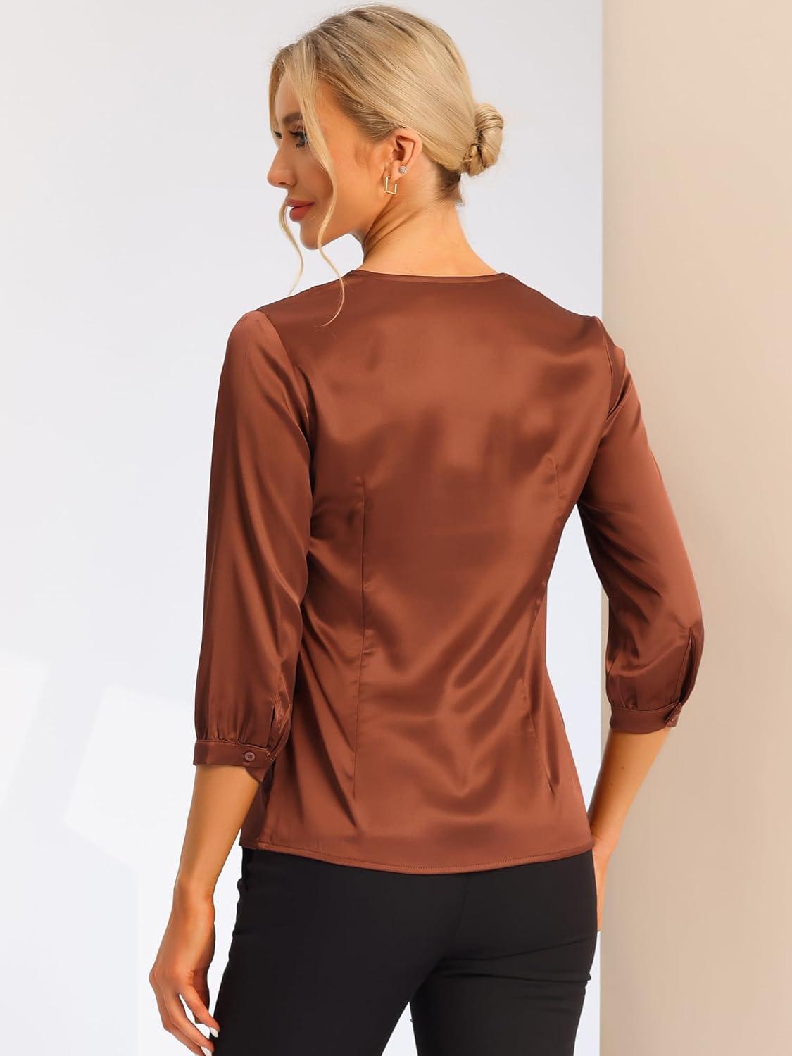 Allegra K Women's Blouse Fall 2025 Dressy Casual Office 3/4 Sleeve V Neck Satin Shirt(Brown)