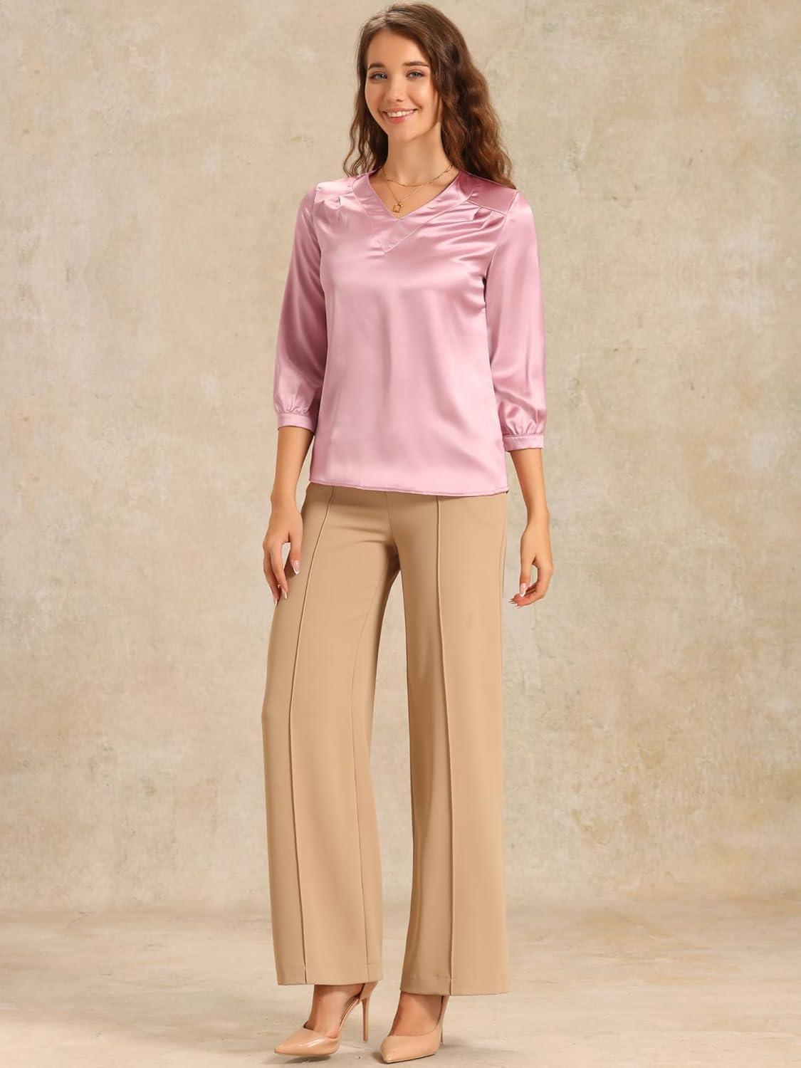 Allegra K Women's Blouse Fall 2025 Dressy Casual Office 3/4 Sleeve V Neck Satin Shirt(Pink)