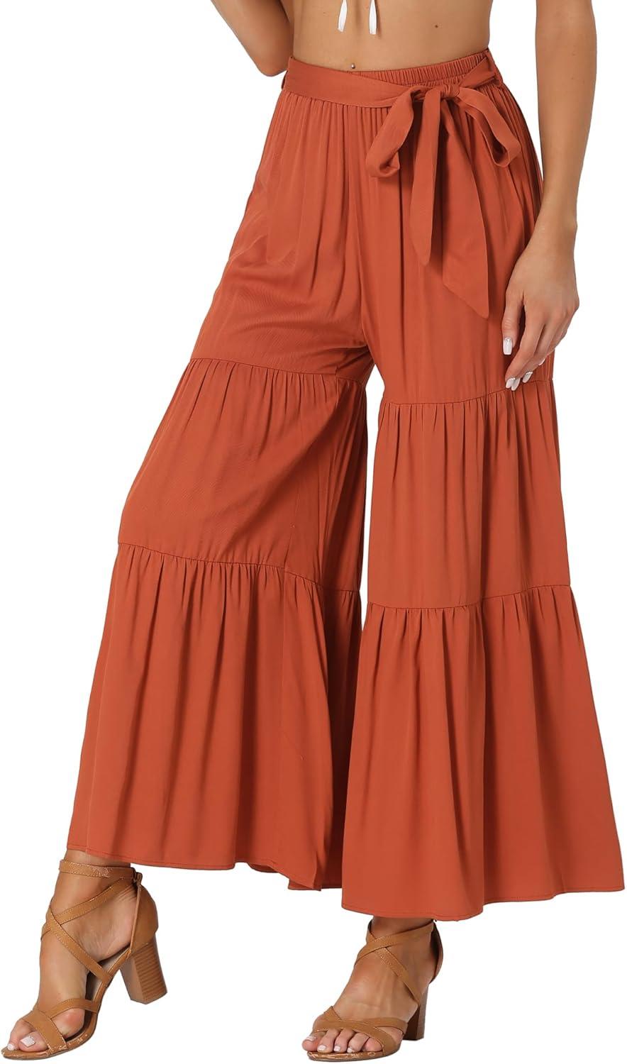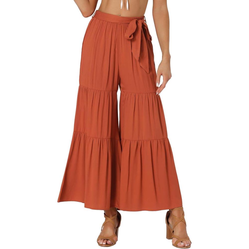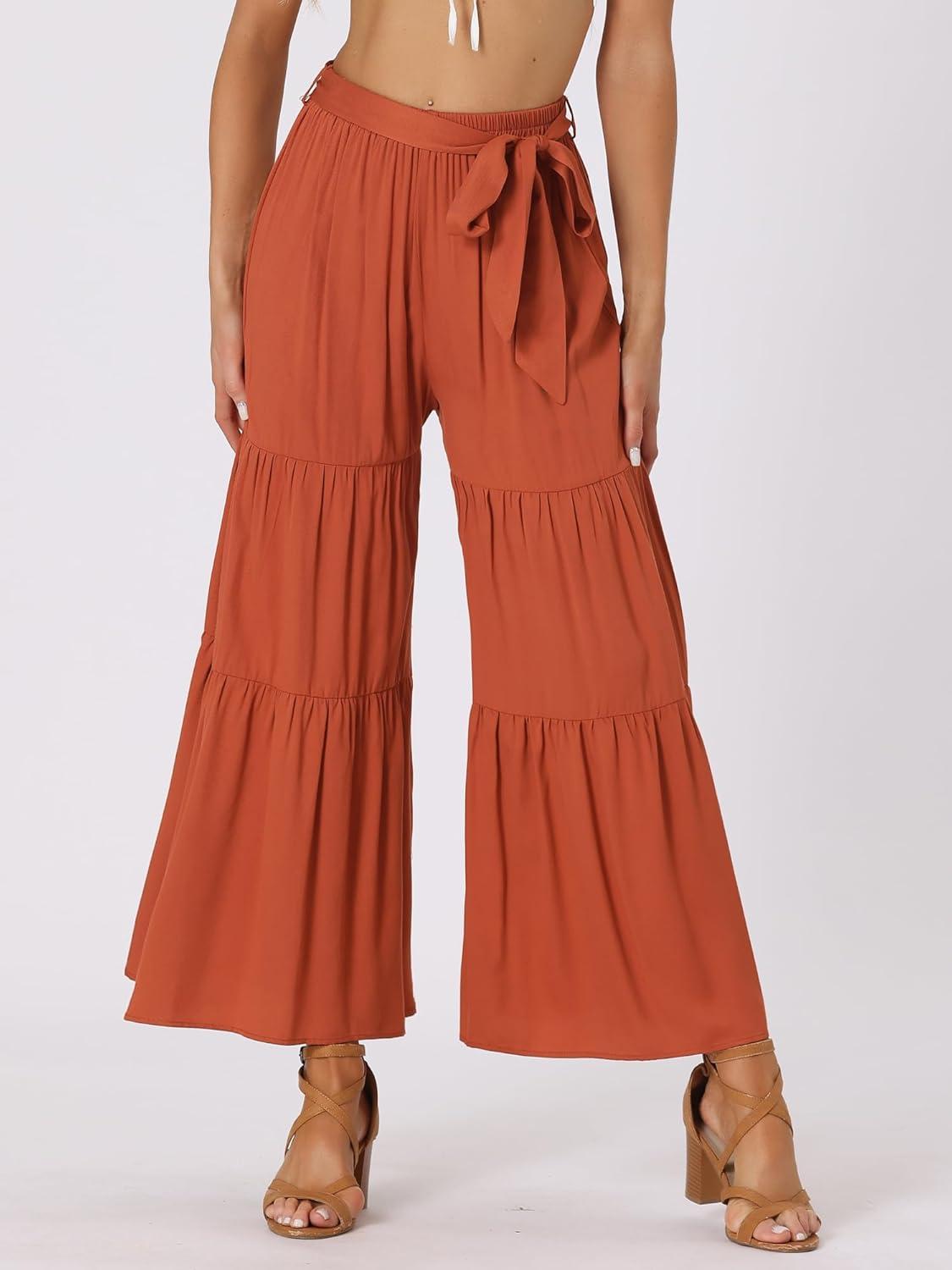 Allegra K Women’s Boho Elastic High Waisted Ruffles Flare Palazzo Wide Leg Pants(Caramel)