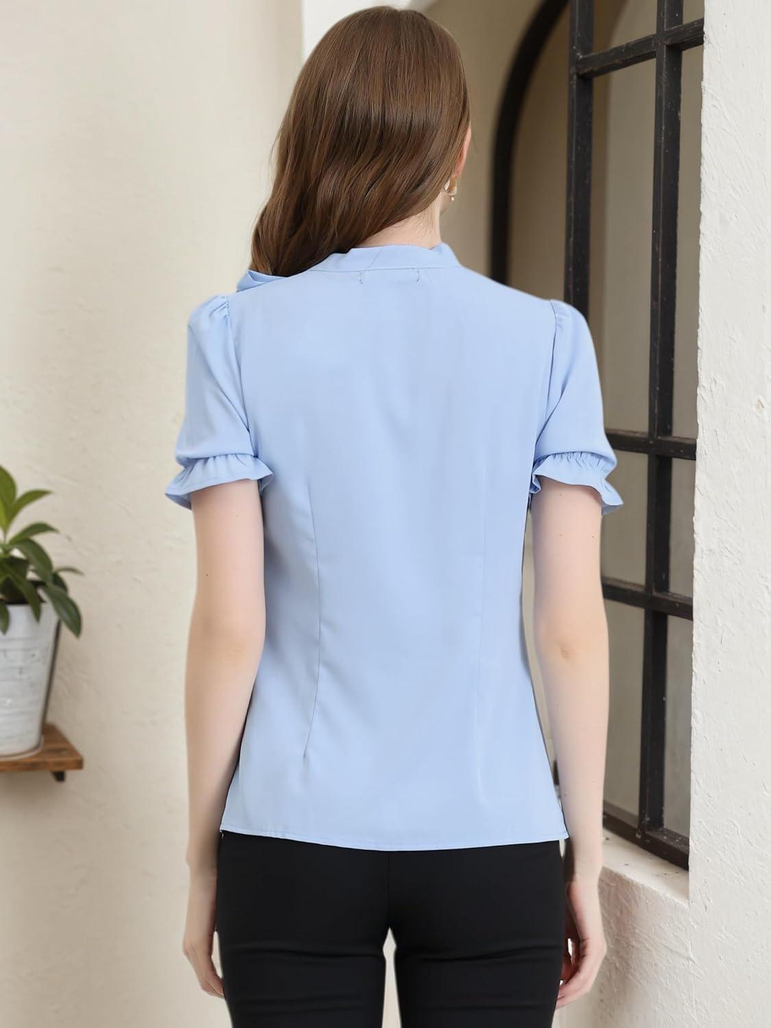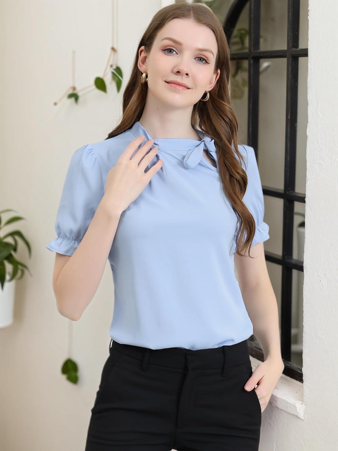 Allegra K Women’s Bow Tie Neck Tops Elegant Office Short Sleeve Blouse(Light Blue)