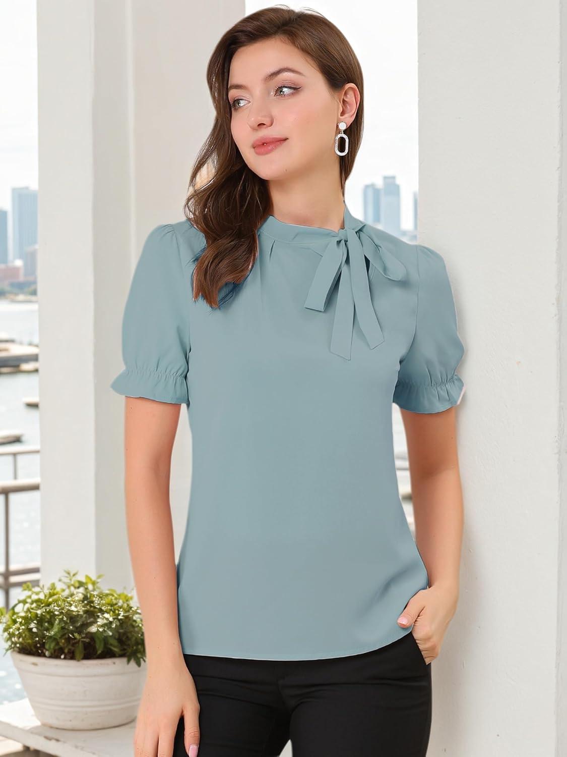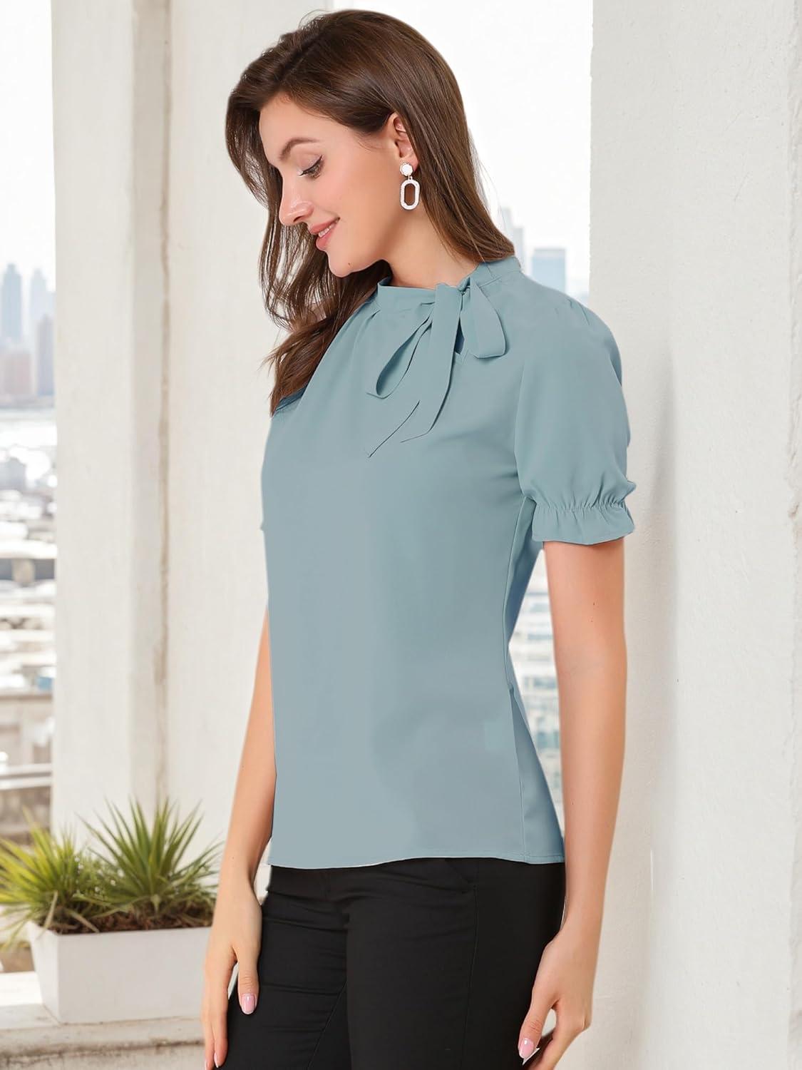 Allegra K Women’s Bow Tie Neck Tops Elegant Office Short Sleeve Blouse(Mint Blue)
