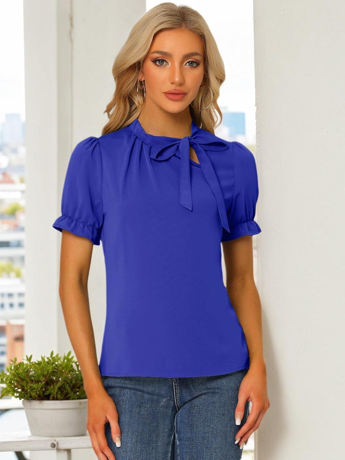Allegra K Women’s Bow Tie Neck Tops Elegant Office Short Sleeve Blouse(Royal Blue)