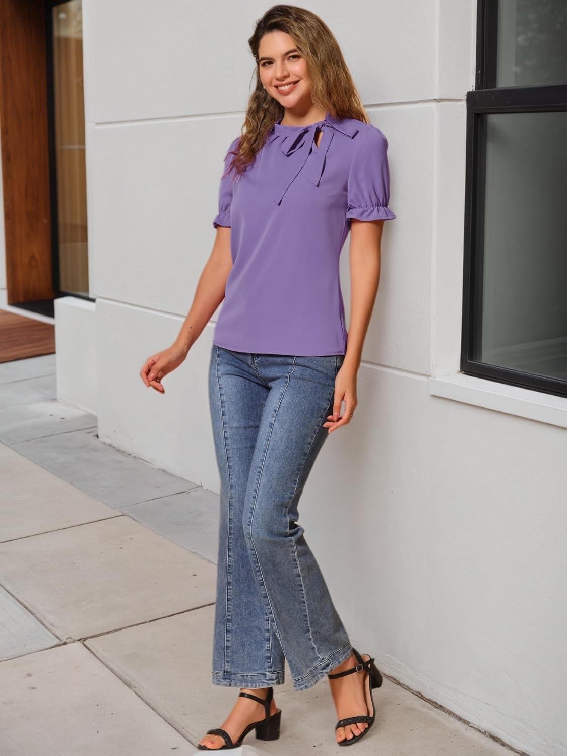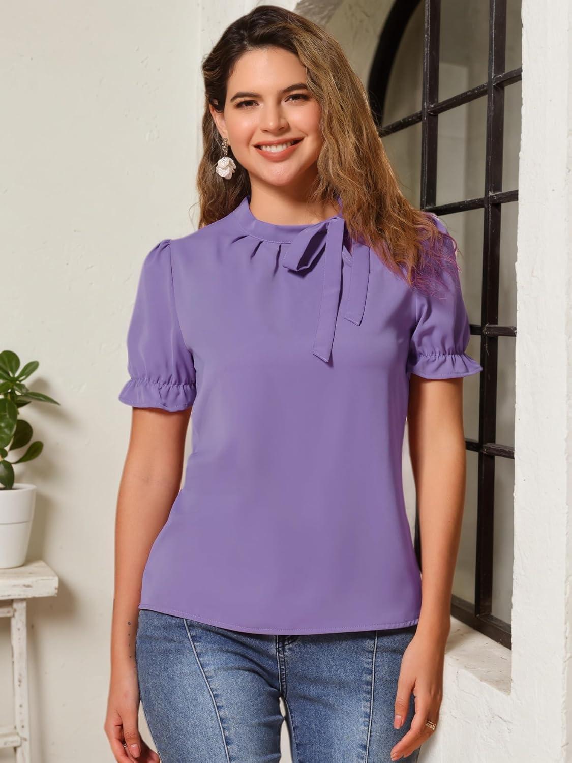 Allegra K Women’s Bow Tie Neck Tops Elegant Office Short Sleeve Blouse(Violet)
