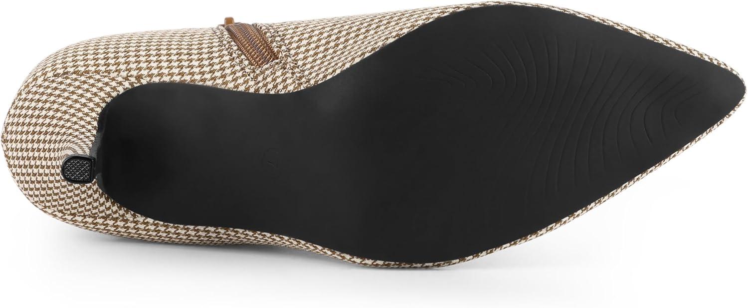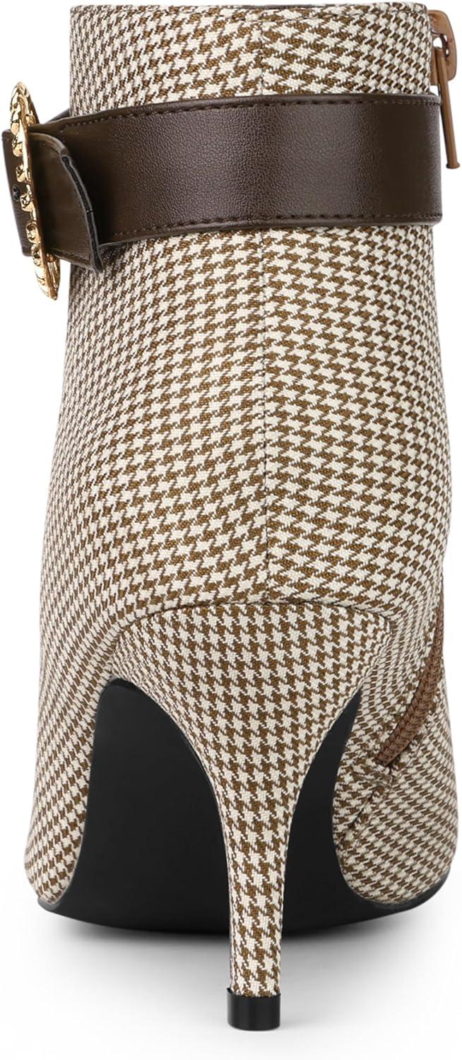 Allegra K Women's Buckle Plaid Stiletto Heels Houndstooth Ankle Boots(Khaki)