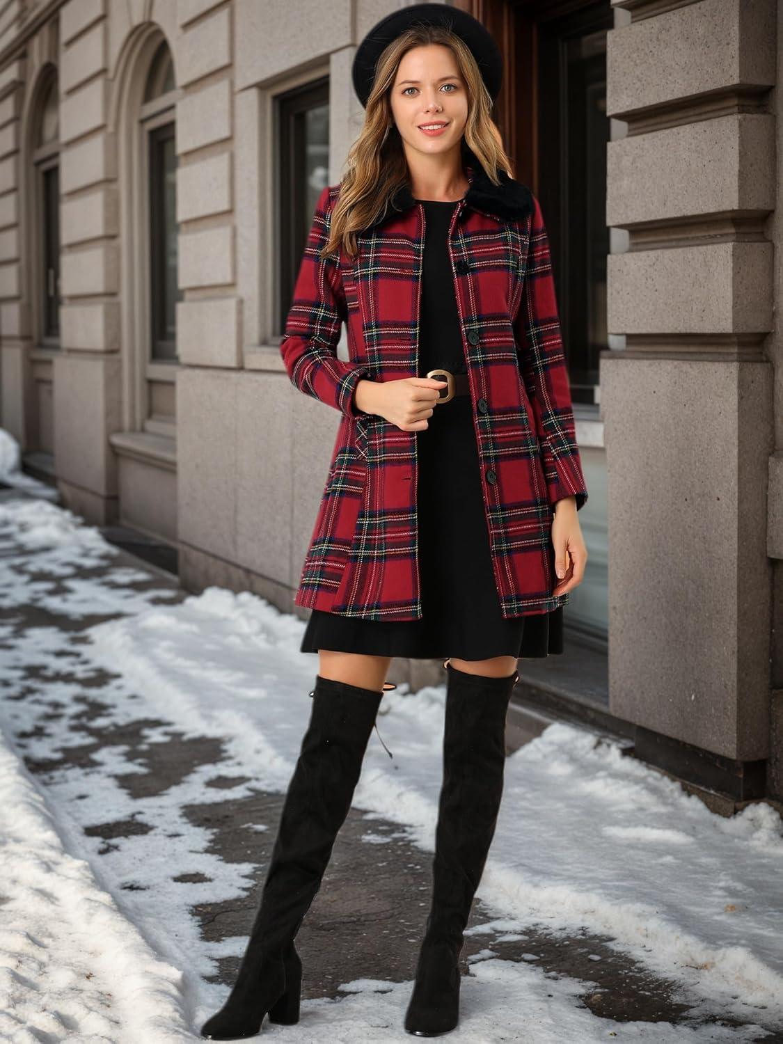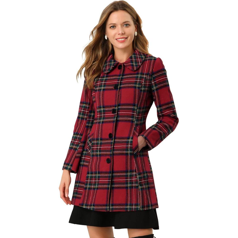Allegra K Women’s Buffalo Checks Shacket Button Down Peter Pan Collar Long Winter Plaid Coat(Red)